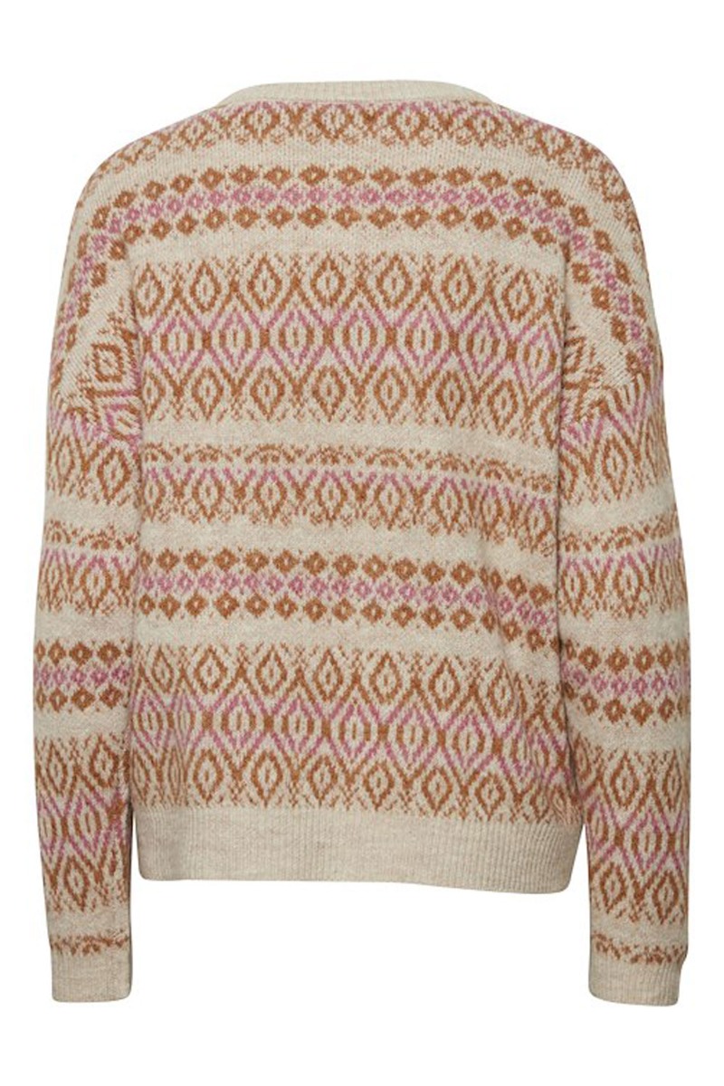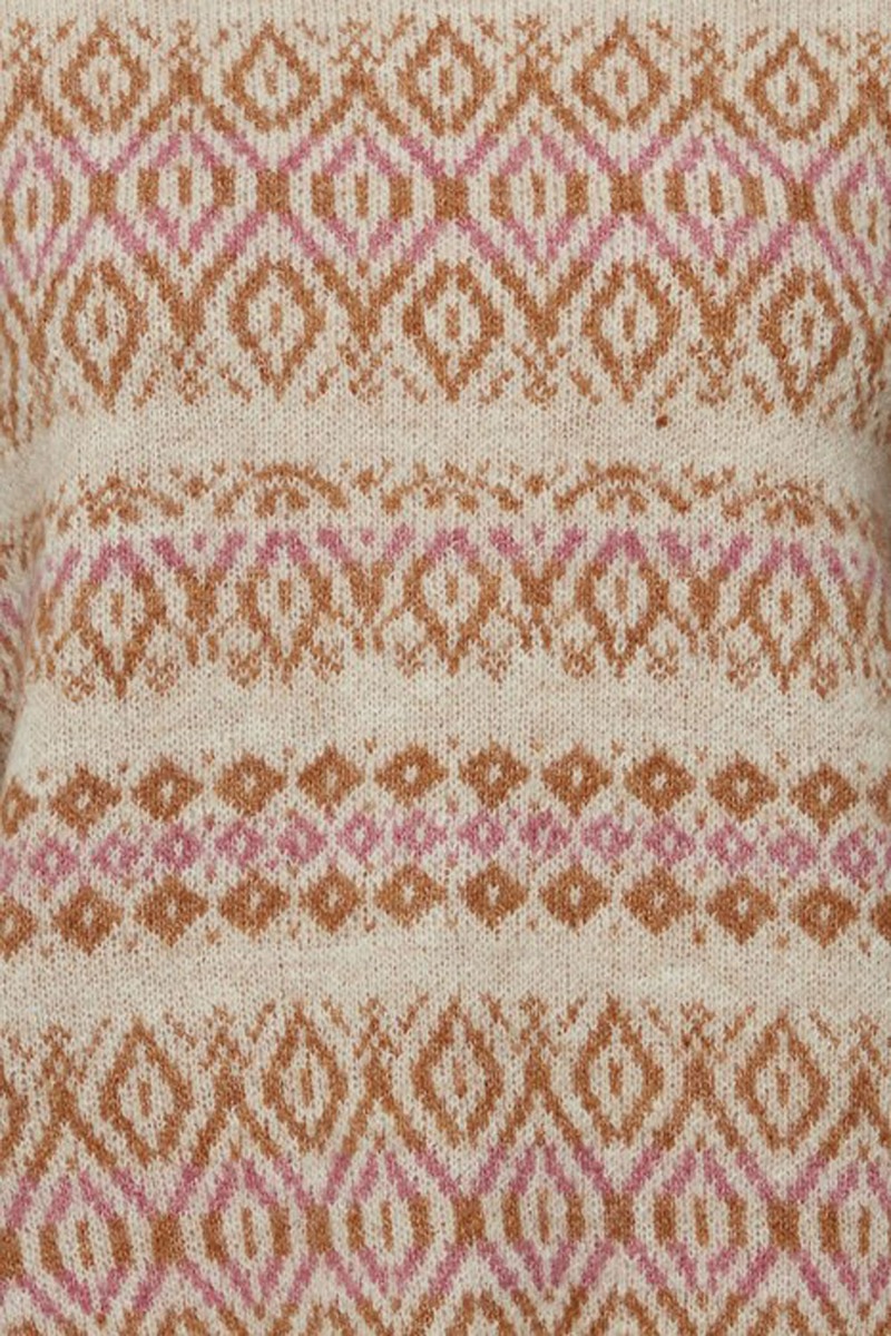 En sød strik fra Ichi med en beige baggrund og et fint islandsk mønster i rosa og brændt nuance. Strikken er dejlig behagelig og holder dig varm alle de kolde dage. Den er med rund halsudskæring og lange ærmer og løs i modellen. Style den til jeans eller en feminin nederdel.