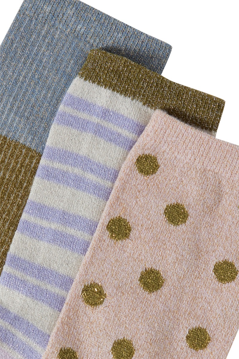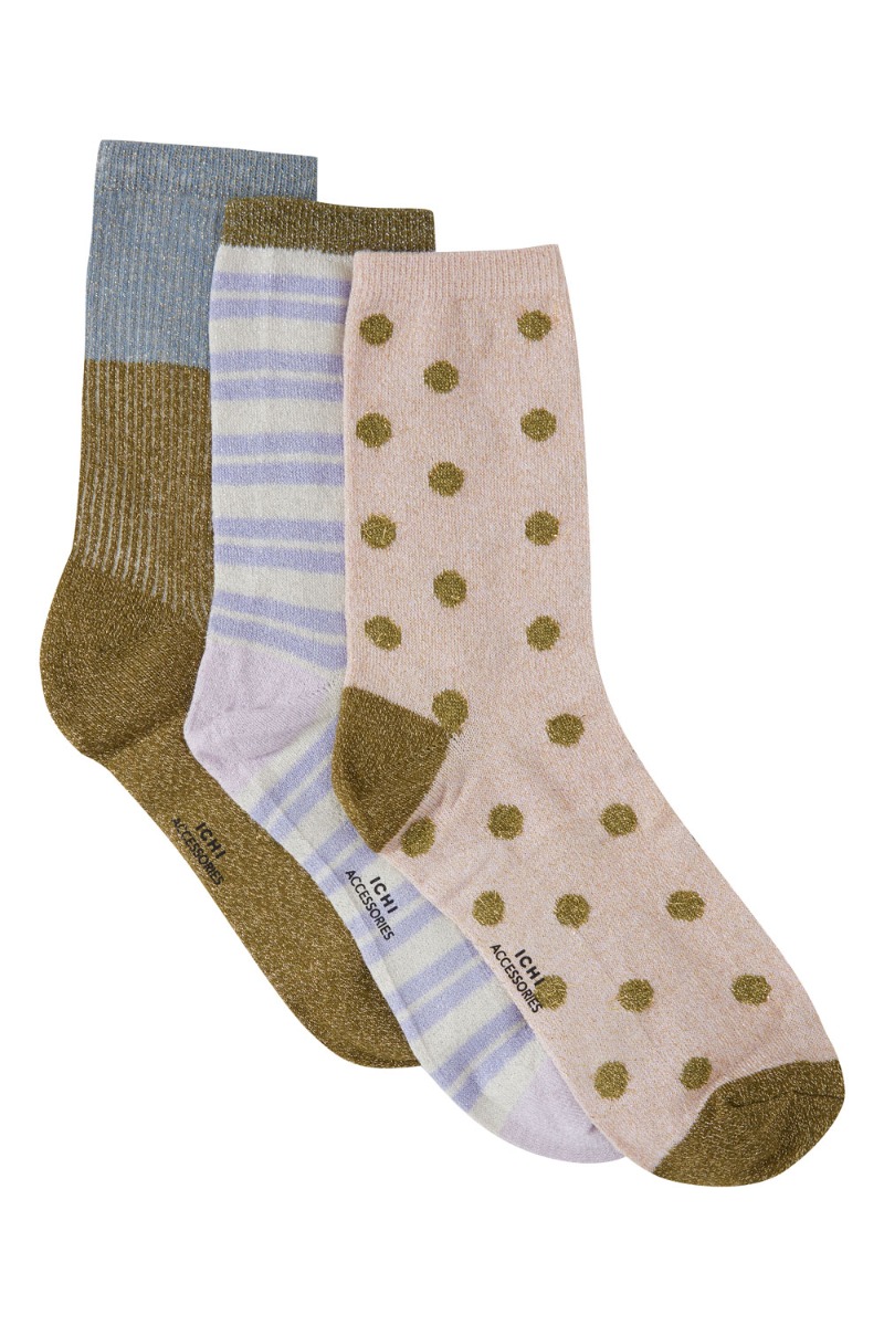 Ichi strømper med glimmer i forskellig print. I pakken får du 3 par med prikker, et med striber og en ensfarvet. De er med til at afslutte dit outfit.