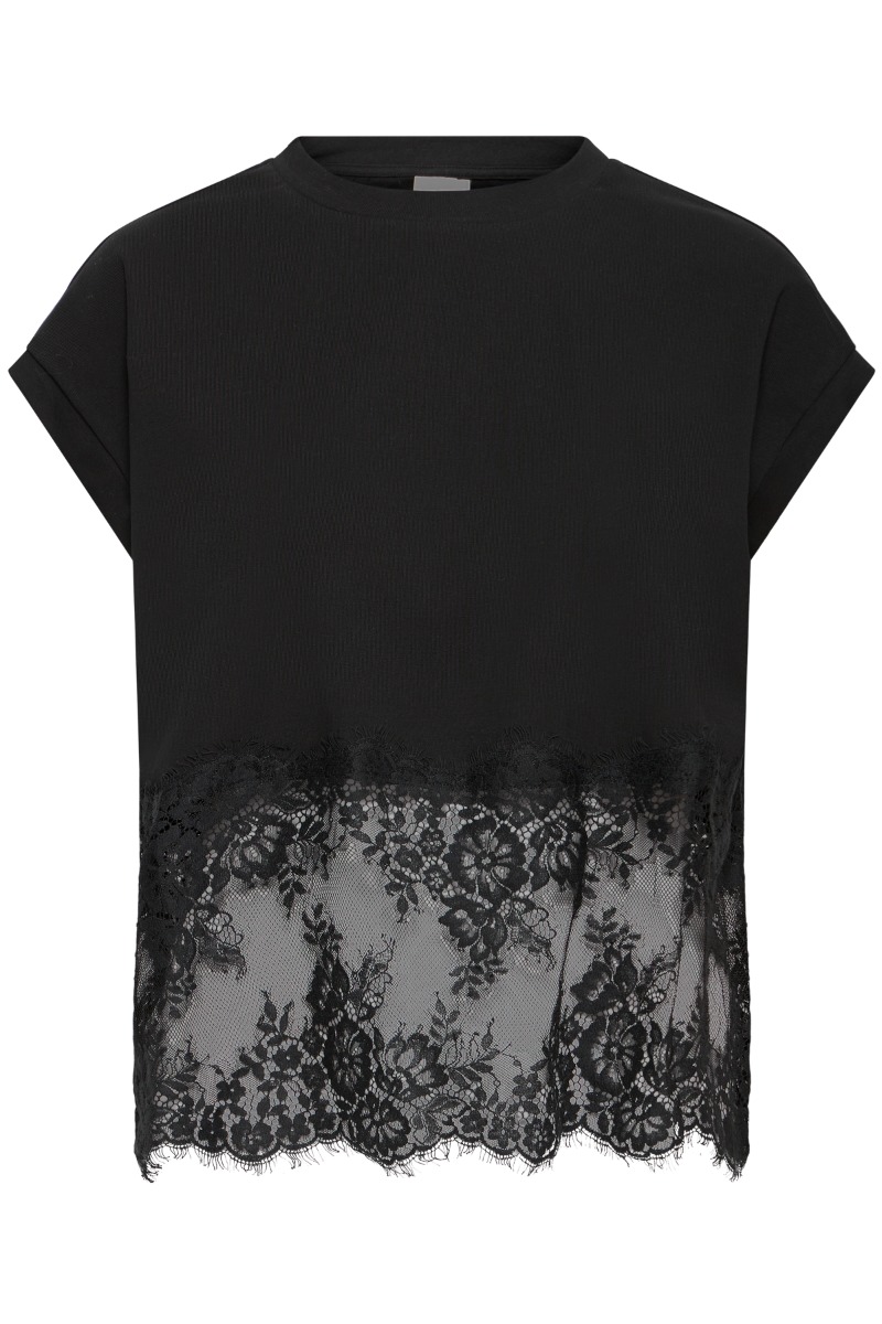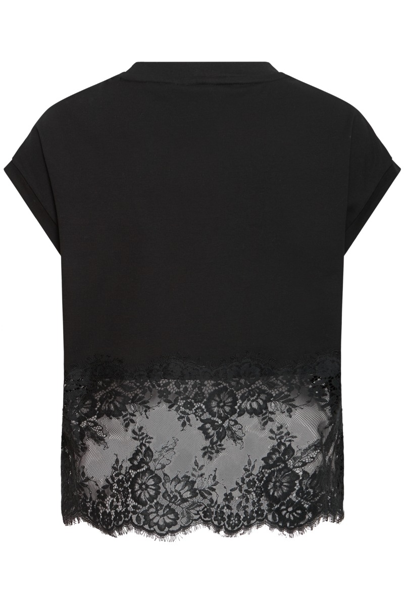 Det er en sort, kortærmet top med et enkelt og rent udtryk øverst, kombineret med en feminin blondeafslutning nederst. Toppen har rund hals og let løstsiddende pasform med små opsmøg på ærmerne. Den nederste del er transparent blonde med et floralt mønster, som giver kontrast til det glatte stof og tilfører et elegant og let sensuelt præg.