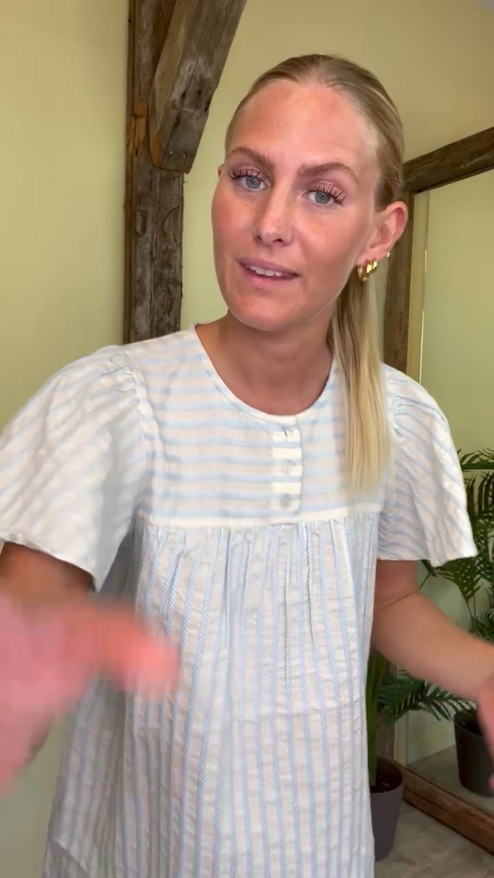 Den fineste t-shirt fra Ichi! T-shirten er hvid med blå striber samt tre knapper ved halsudsæringen. Den har fine løse ærmer og der findes matchende fine shorts til, så du kan skabe dig et helt sæt.