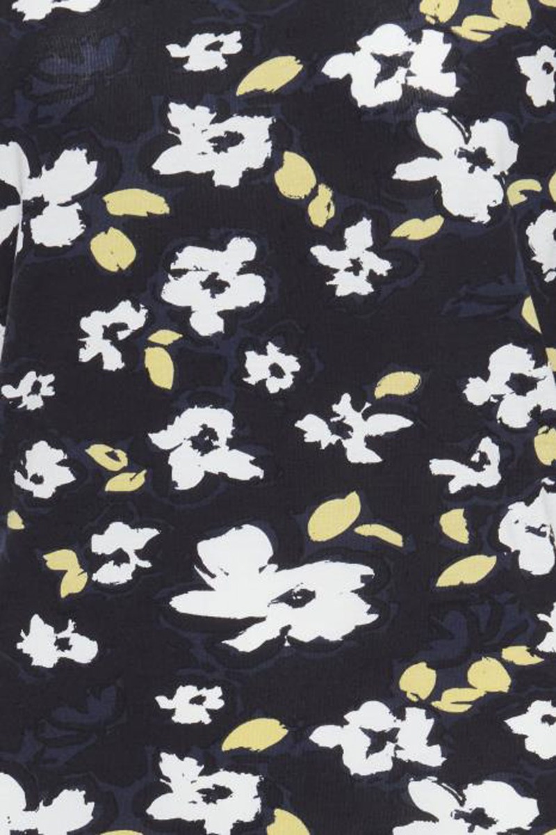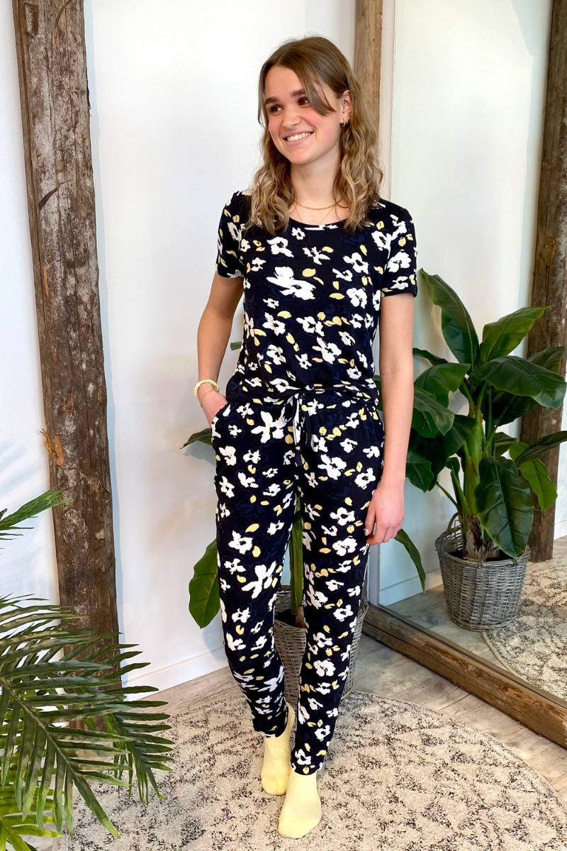 Vores allesammens favorit "Lisa serie" fra Ichi er endelig landet. Denne t-shirt er lavet i det blødeste materiale som vi kender den med masser af stræk. Den har en klassisk pasform med rund halsudskæring. Bundfarven er navy med et blomsterprint i sort, hvid og gul. Selvom vi hos Lykke by Lykke bruger dette sæt allermest som et hyggesæt i weekenden, kan man sagtens style det til hverdag.