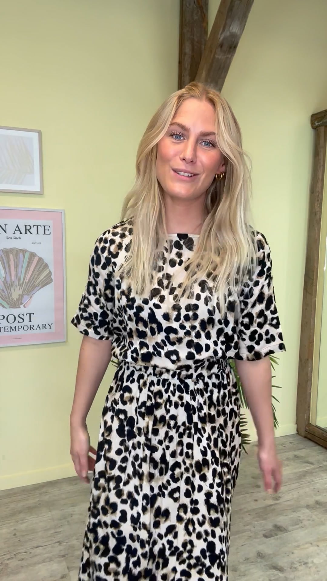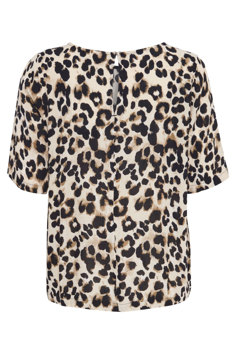 Klassisk løs t-shirt fra Ichi i leopard print. T-shirten er i en let behagelig kvalitet med rund hals og et lille ærme. Den lukkes i nakken med en enkelt knaplukning der skaber en lille åbning. Style den med matchende underdele eller til et par jeans.