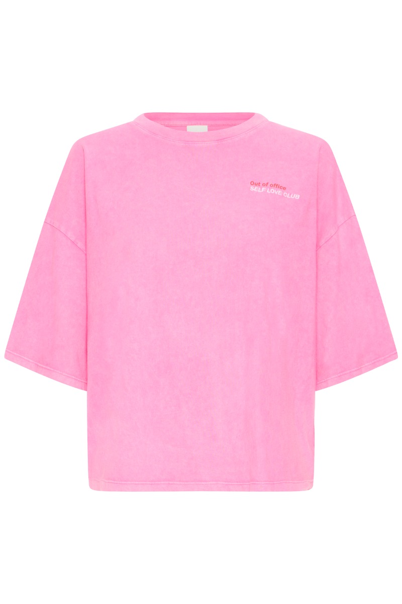 Smuk T-shirt fra Ichi i en lækker lyserød farve. Den er perfekt til den kommende sæson og kan styles med både jeans og nederdele. Den er i et oversized look og har et cool kirsebær print på ryggen.