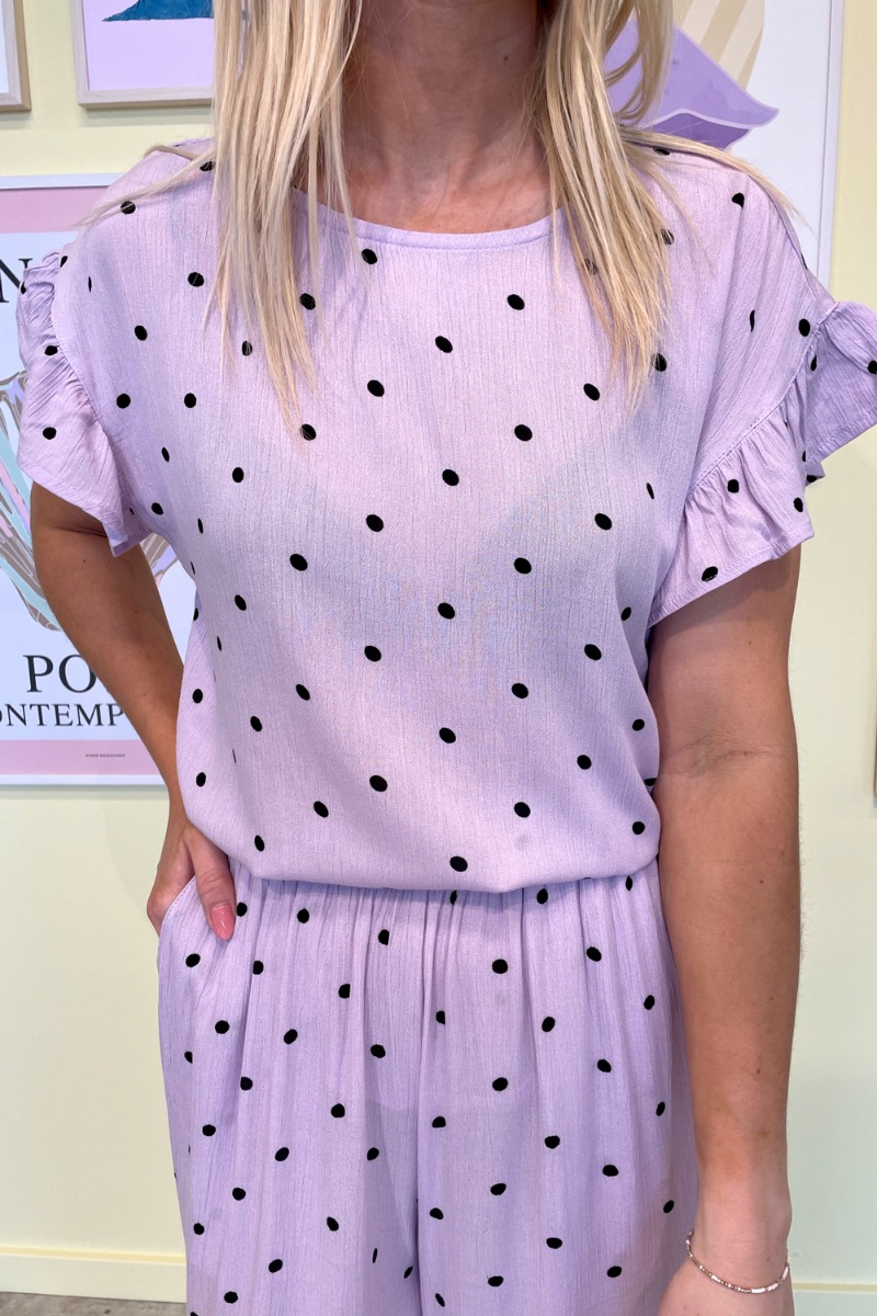 Smuk t-shirt fra Ichi i pastel lilla med sorte prikker og flæser ved ærmerne. Super fin sommer t-shirt som bare er så smuk i farven. Den lukkes i nakken med en matchende knap. Der er rund halsudskæring og er dejlig let i stoffet.
