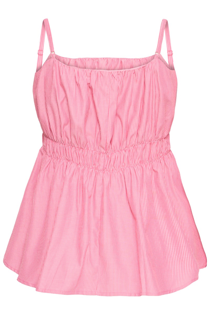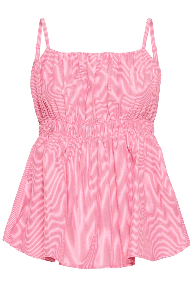 En fin top fra Ichi med striber i hvid og pink. Den er med justerbar stropper og har en smule peplumeffekt i underdelen. Den er en let kvalitet og passer fint sammen med den matchende underdel.