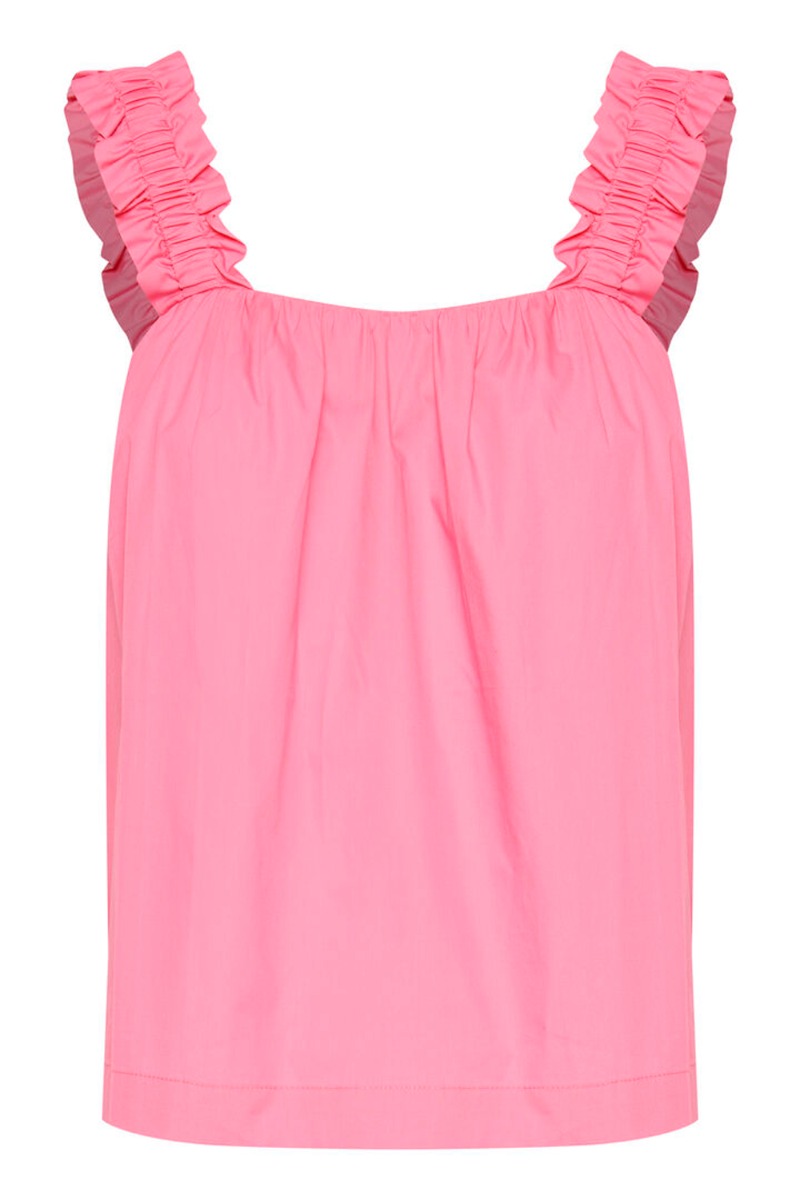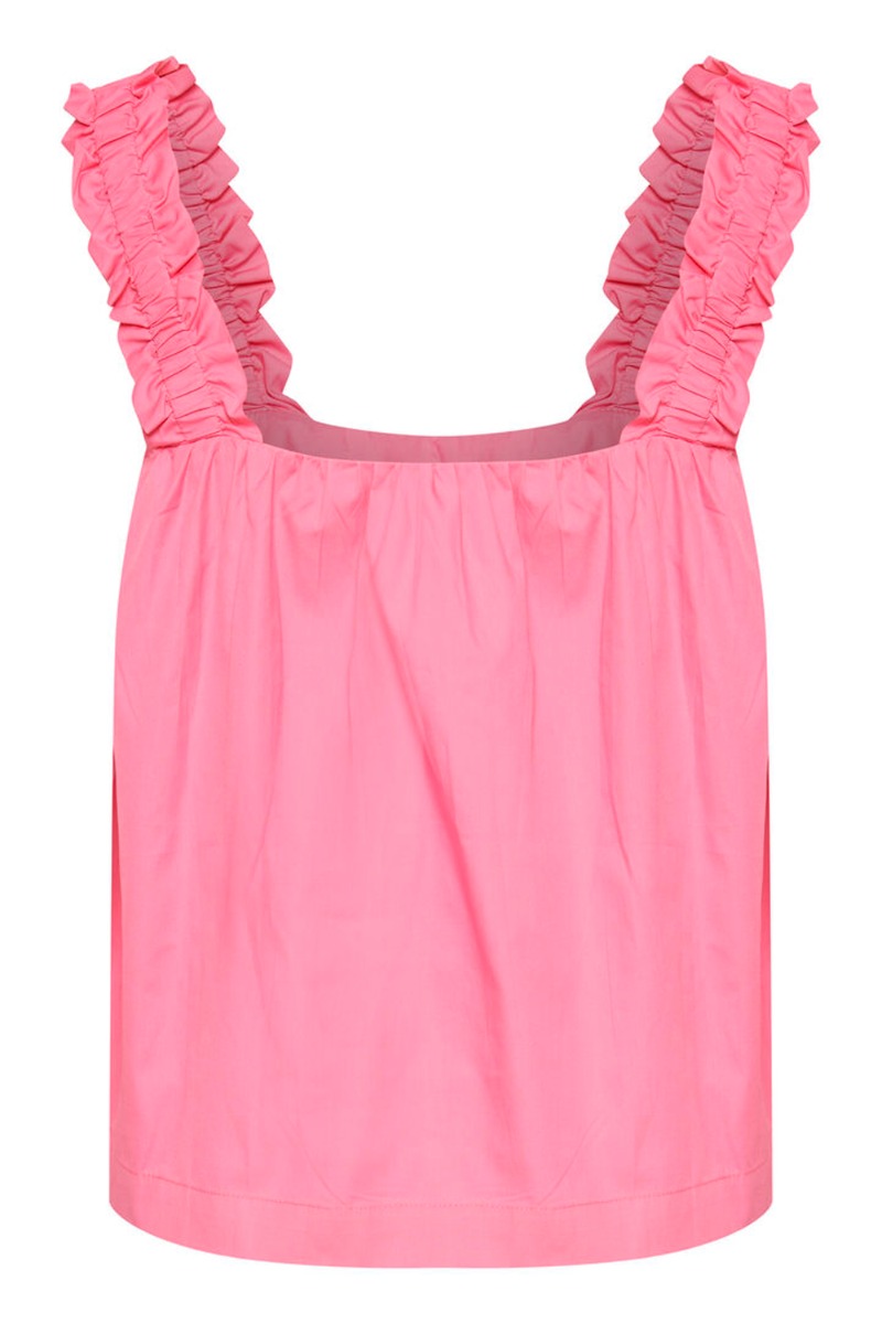 Så cool pink top fra Ichi. Toppen har brede flæsestropper med elastik og en løstsiddende pasform. Super flot at style med de matchende shorts eller til et par bukser i en anden farve for et mere dæmpet look.