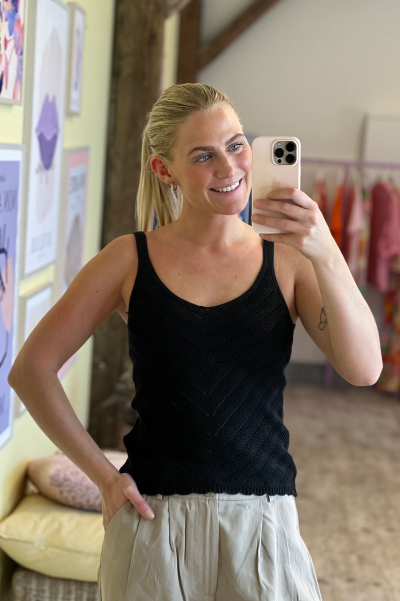 Strikket sort top fra JDY med tynde stropper og en blød v-udskæring både for og bagtil. Toppen er perfekt til de varme sommerdage, da den har det fineste hullede mønster. Style den til et par shorts eller under dine bluser.
