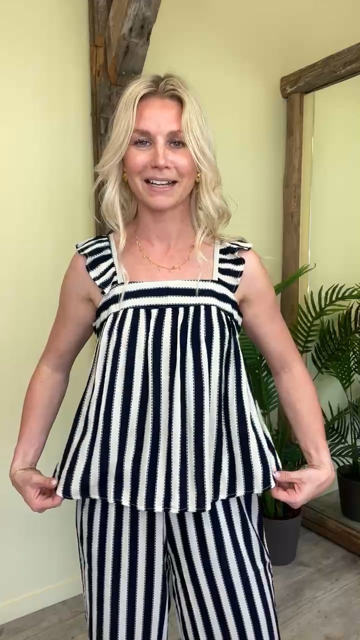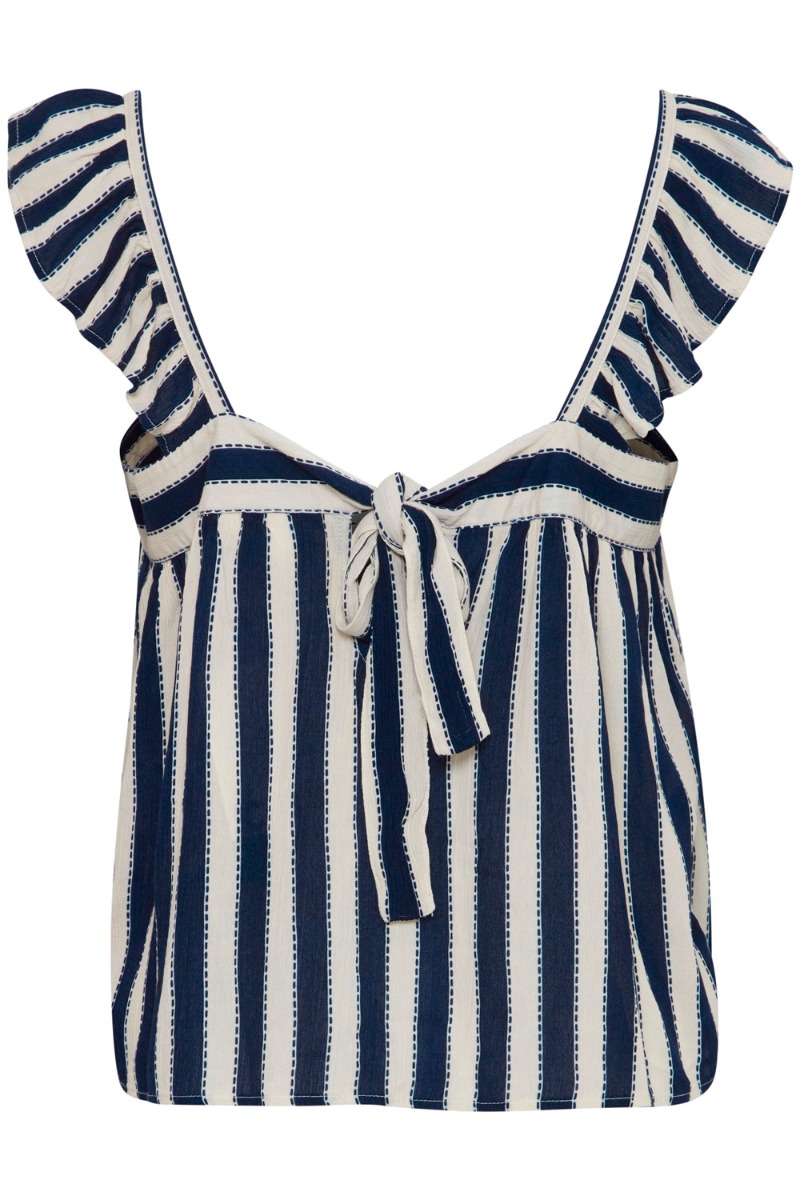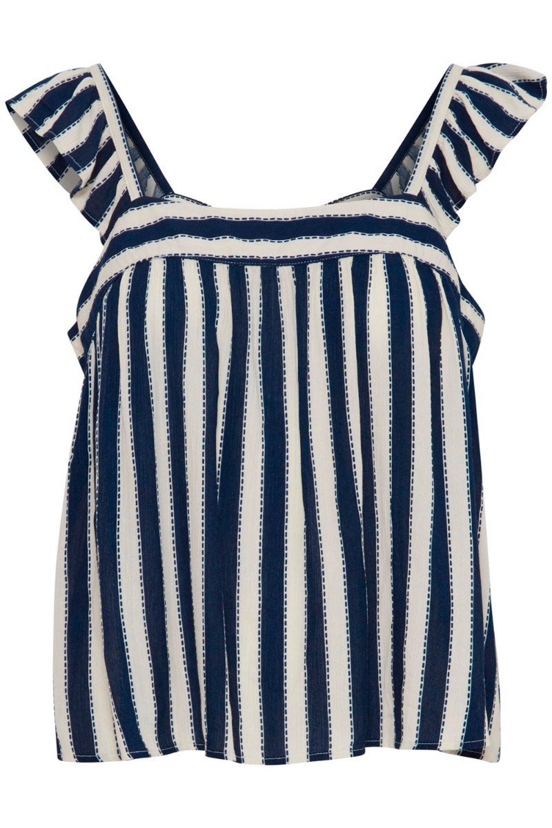 Den dineste top fra Ichi. Toppen er blå og hvid stribet og er med fine flæseærmer. Der findes tilhørende bukser til, så du kan skabe et helt sæt.