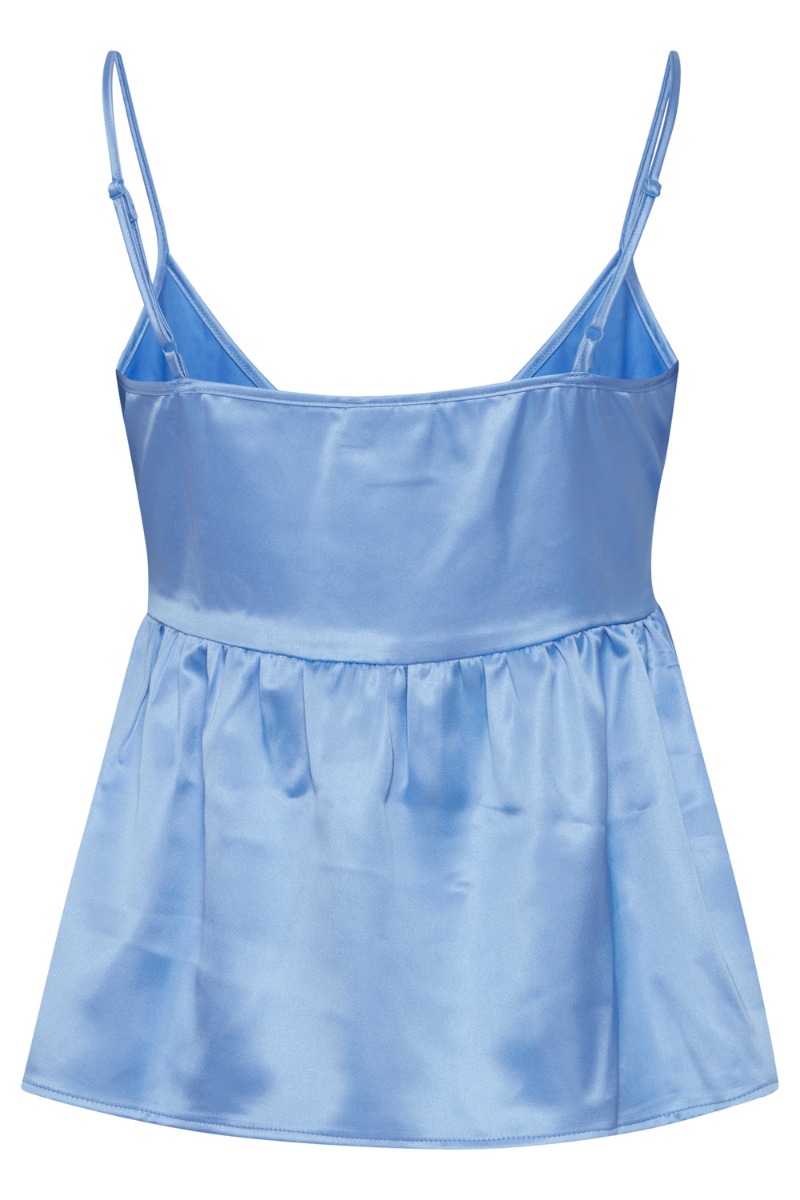 En sød lille top fra Ichi i den fineste blå nuance med shineeffekt. Toppen har tynde spaghetti stropper der kan justeres efter eget ønske. Pasformen er løs med v-udskæring og peplum i bunden der giver et feminint udtryk. Denne top er sød at style med en pæn buks eller jeans til en stilet.