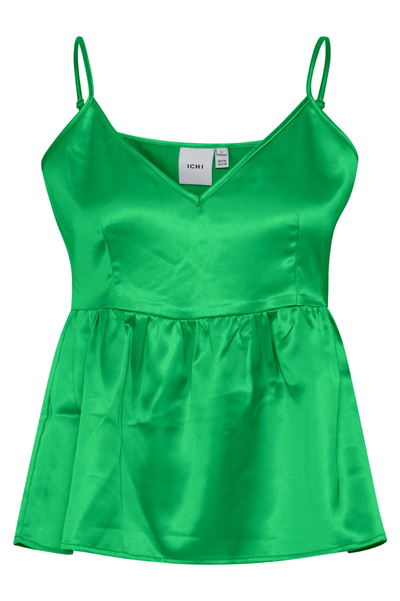 En sød lille top fra Ichi i en smuk grøn nuance med shineeffekt. Pasformen er løs med en lille v-udskæring og peplum i bunden. De tynde spaghetti stropper kan justeres efter eget ønske og er super fin at bruge til de festlige anledninger med en buks eller nederdel.