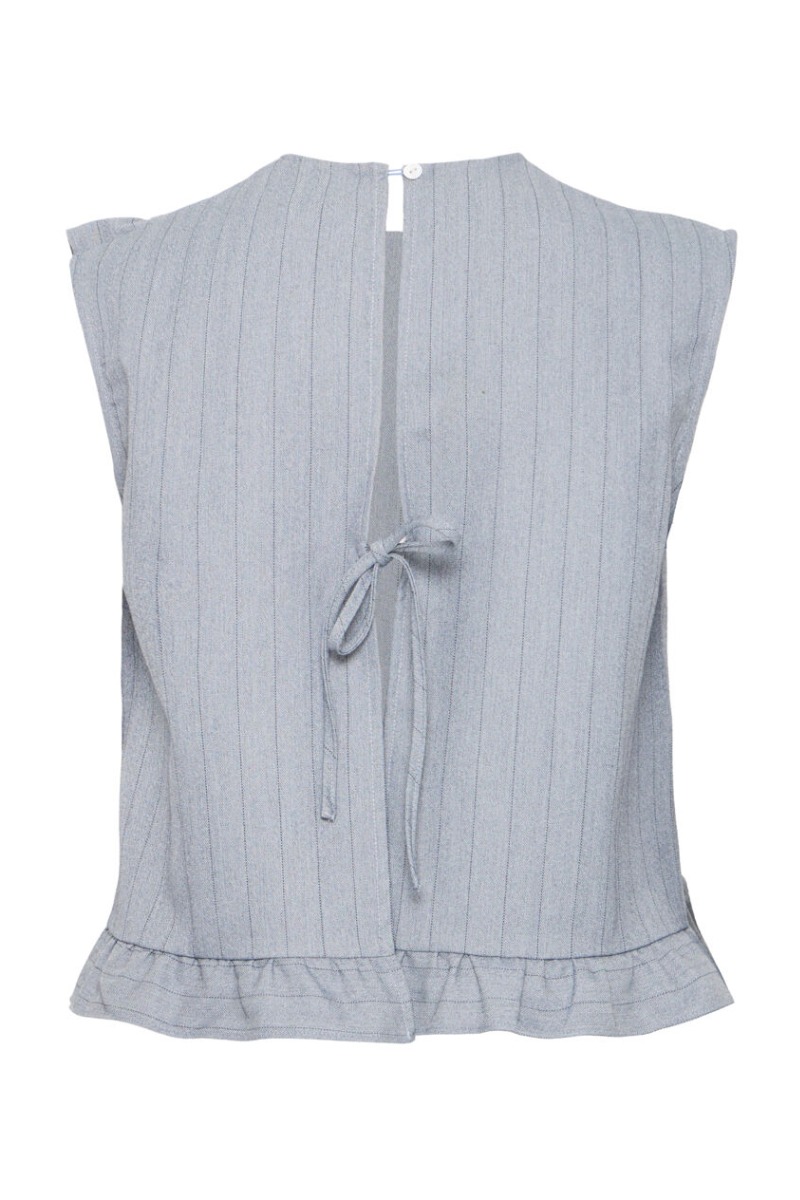 En super sød top fra Ichi med de fineste detaljer! Toppen er ærmeløs og har en overlappende flæsekant foran, som giver den et super fint udtryk. Bagpå er toppen åben, men holdes sammen i nakken af en knap samt et bindebånd på ryggen.