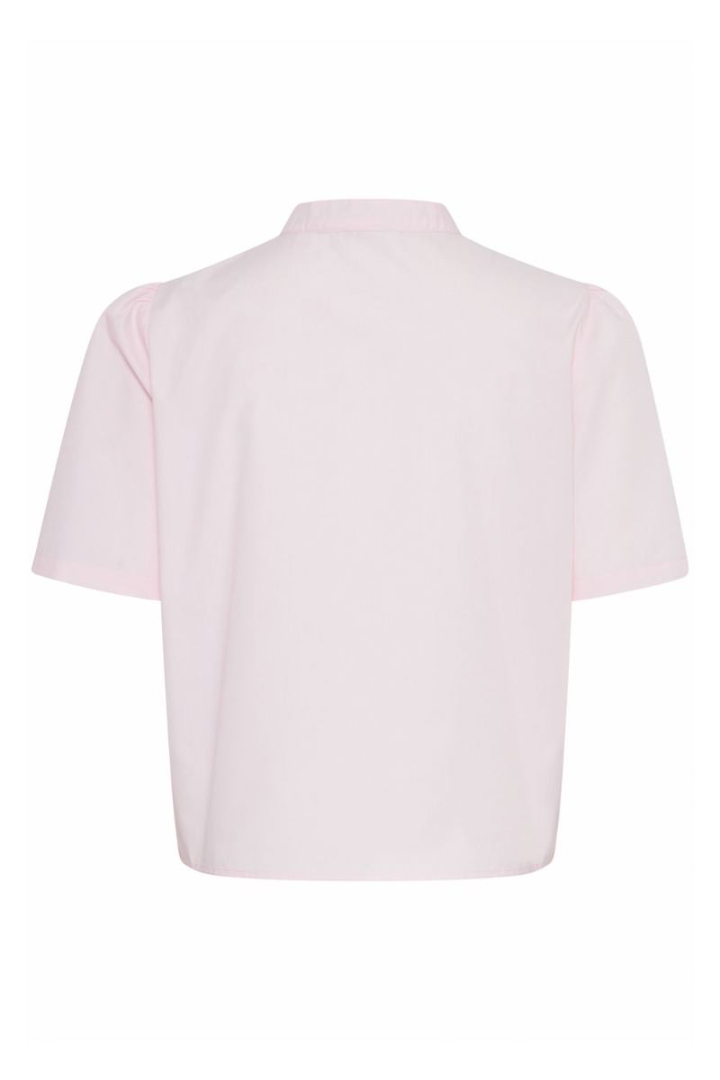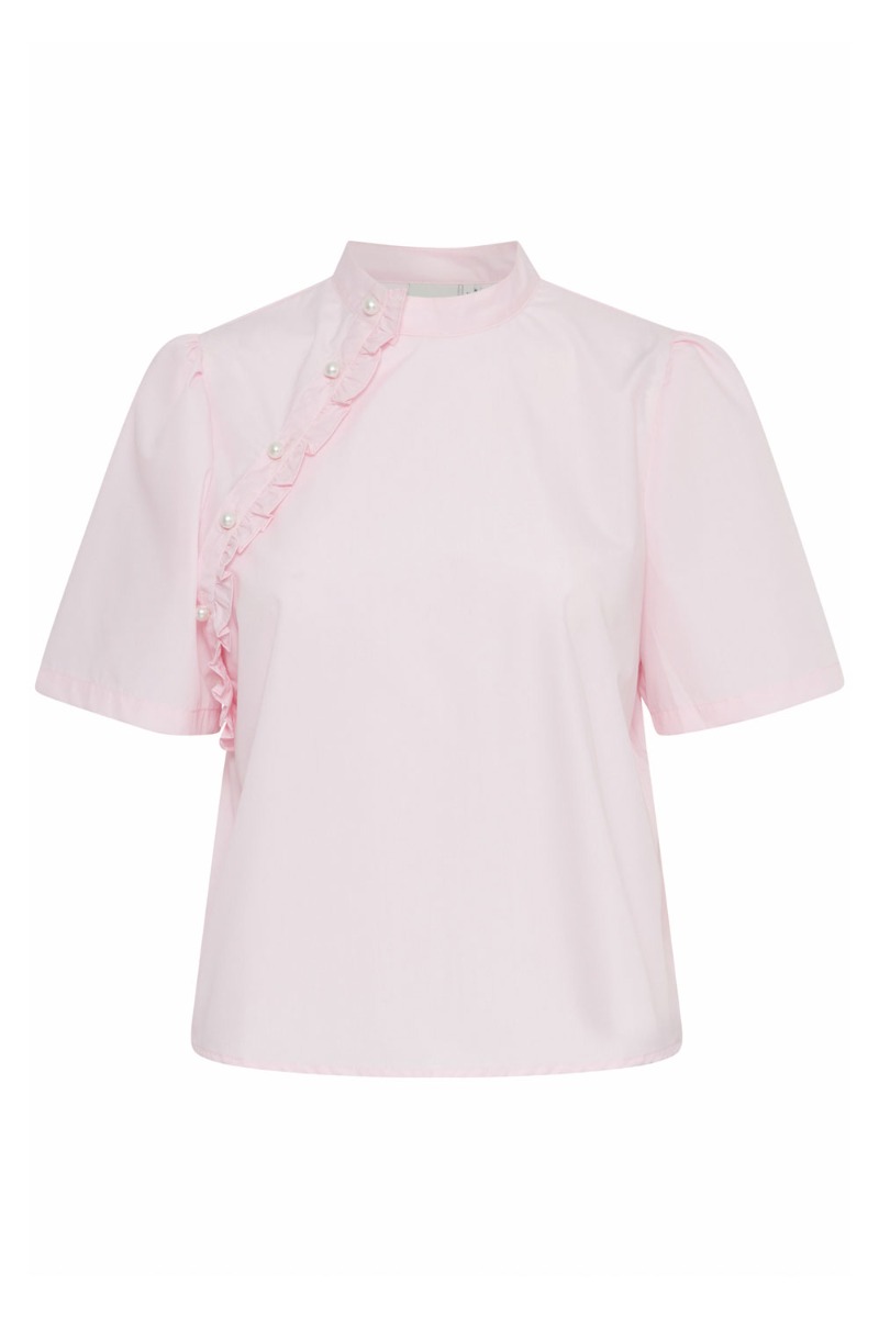 Rosa skjorte med perlemorsdetaljer foran. Skjorten er i det fineste look med flæsedetaljer langs kraven og korte t-shirtærmer. Den er i en løs pasform og er bare så sød og nem at style til alle anledninger. Toppen er en model i har set før og revet væk, så vent ikke for længe hvis du skal nå at have fingrene i denne smukke sag fra Ichi.