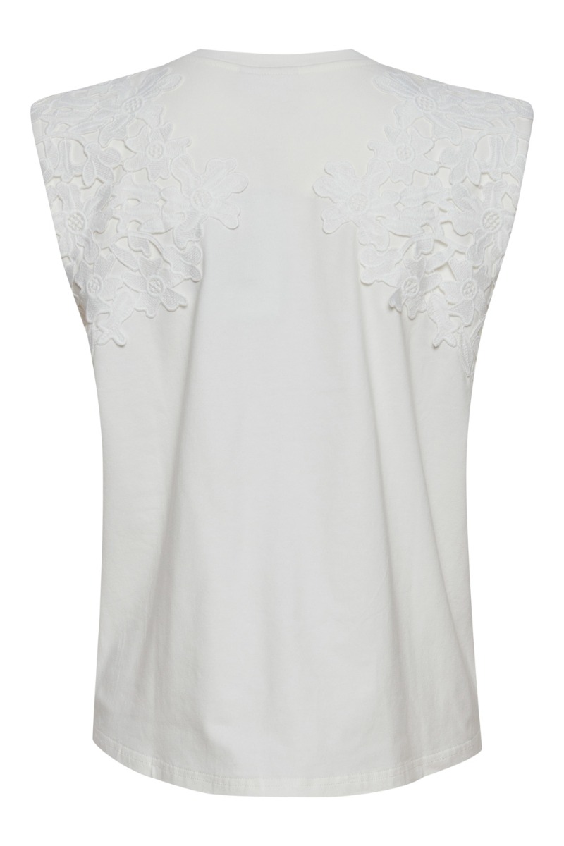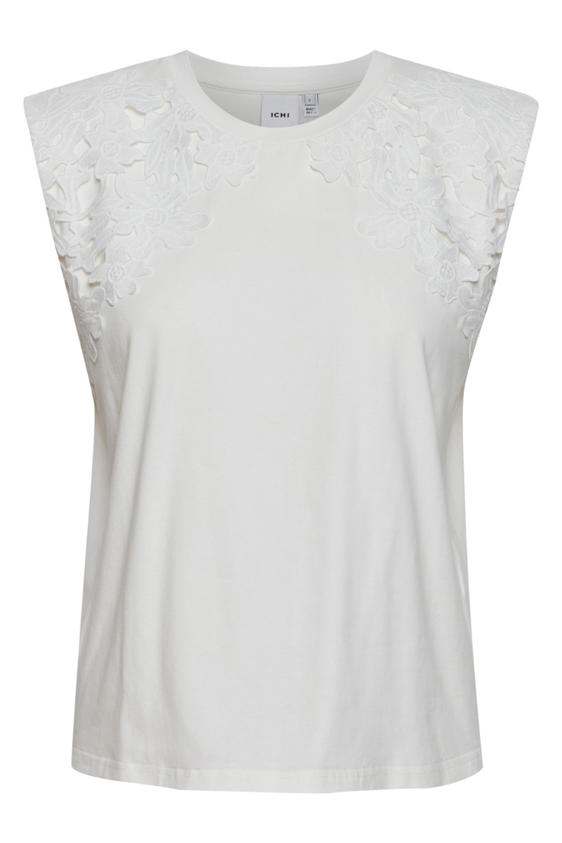 En fin enkel top fra Ichi i hvid. Toppen er løs i en lige pasform med en lille skulderpude der giver en cool detalje. Den er designet med blondedetalje ved skulderen hvilket gør den anvendelig både til hverdag og fest.