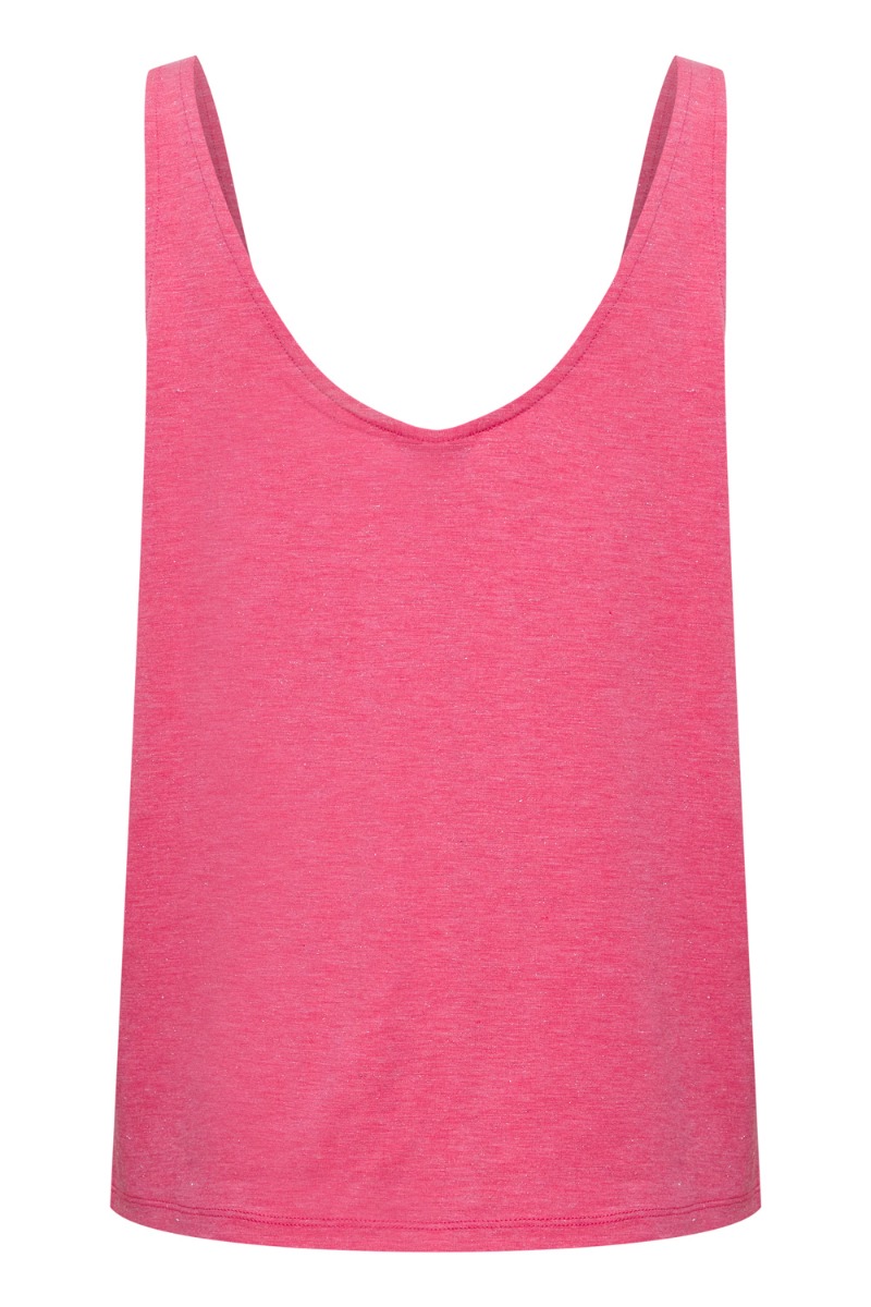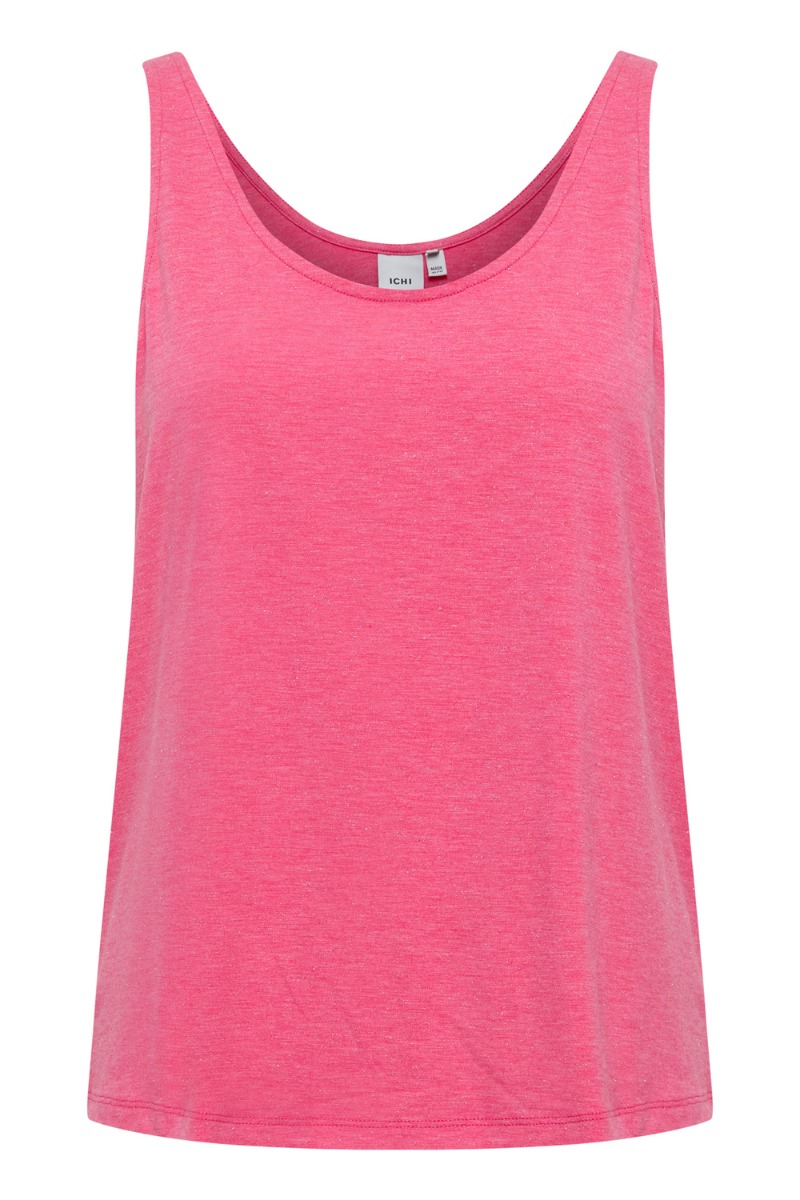 En enkel top fra Ichi i meleret pink med en lille diskret glimmerdetalje. Toppen er løs med en dyb rund udskæring både foran og bagpå. Toppen er lavet i en dejlig behagelig kvalitet med stretch og findes i flere farver.