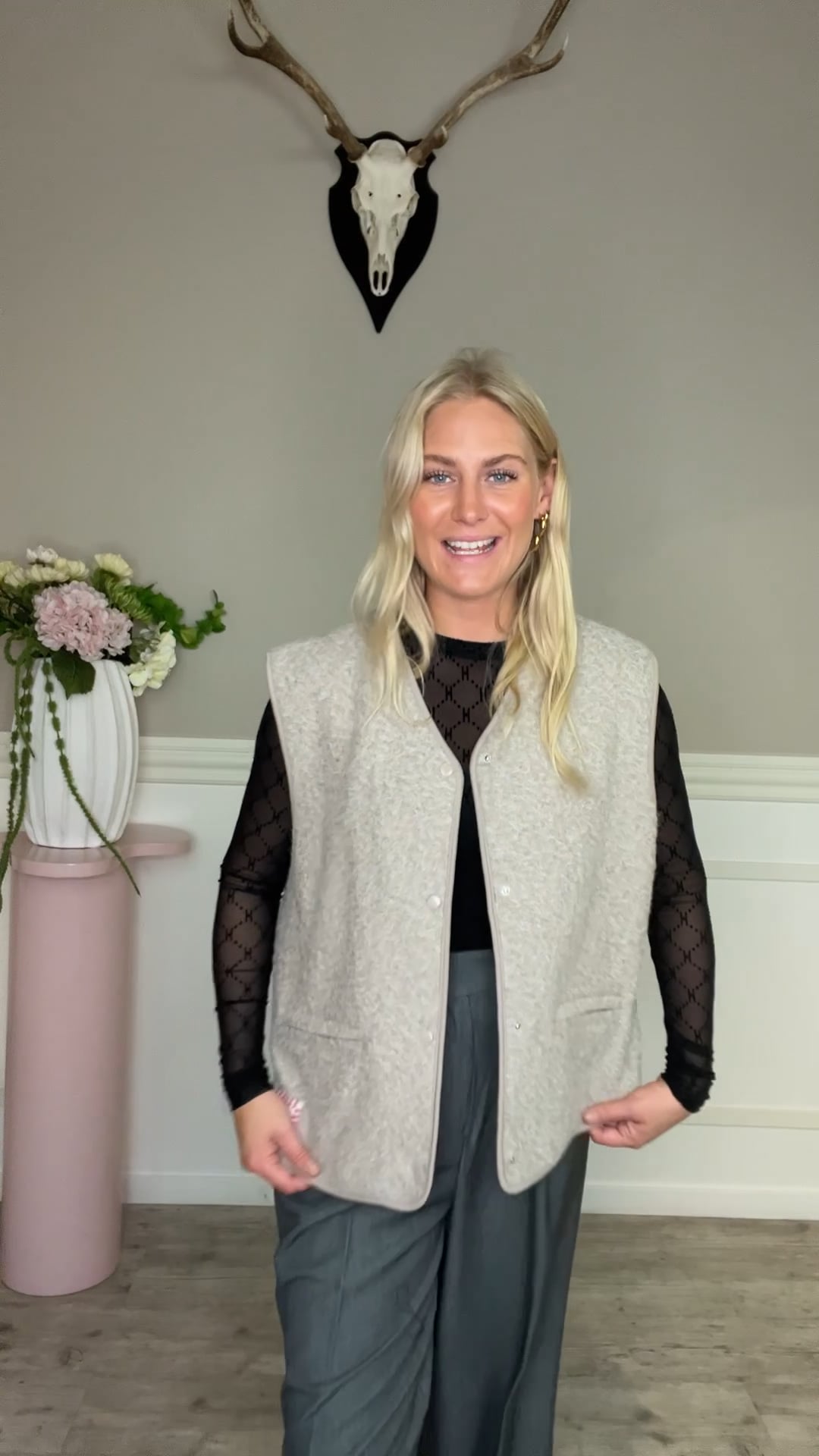 En simpel vest fra Ichi i et uld look. Den er nem til hverdag både åben og lukket hvor du kan bruge en bluse eller en t-shirt under. Den har flade lommer foran og en lille detalje i bunden. Den findes også i brun.