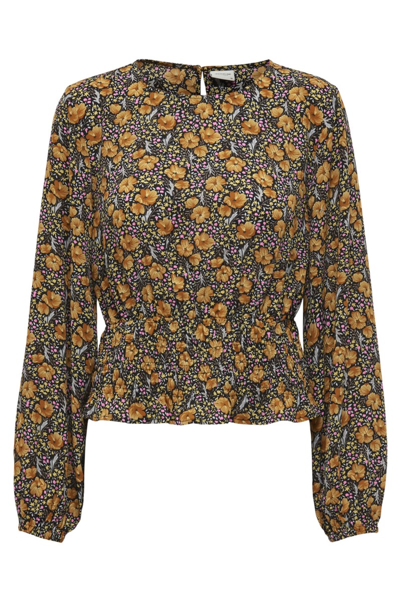 Feminin bluse med sort baggrund og orange blomsterprint. Blusen har en kort længde med smockdetalje i bunden der giver en sød pasform. Den er super fin at style til et par højtaljet bukser eller jeans.