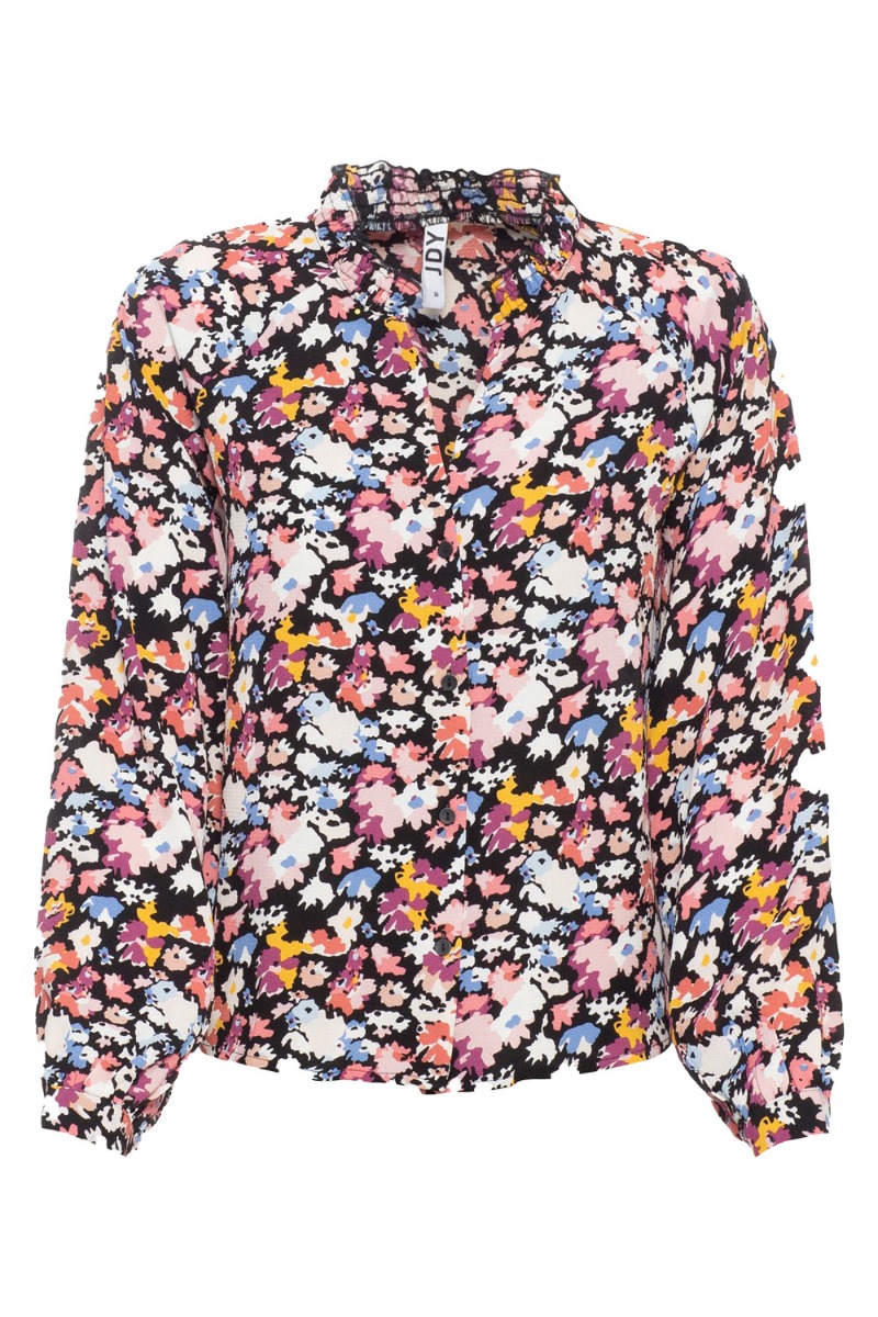 Fin bluse fra JDY med et grafisk blomsterprint i rosa, blå og gule nuancer på sort baggrund. Blusen har smockdetalje ved kraven og en lille v-udskæring foran der lukkes med knapper hele vejen ned. De lange ærmer knappes ved håndleddet og er perfekt at style til hverdag med jeans eller en pænere buks.