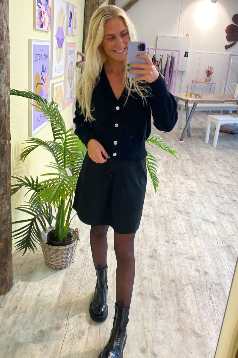Sort cardigan med similiststen foran der giver en smuk detalje. Cardiganen er lavet i den blødeste kvalitet med v-udskæring og lange ærmer. Den er kort i modellen, hvilket gør den perfekt at style både alene og over dine kjoler.