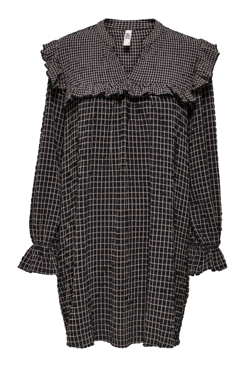 Enkel kjole fra JDY i ternet mønster. Kjolen har et løst snit med en lille v-udskæring og flæsedetalje øverst. De lange ærmer afsluttes med elastik der giver en sæd flæsekant. Kjolen er lavet i et behageligt crepe materiale og kan nemt bruges med en rå støvle og strømpebukser.