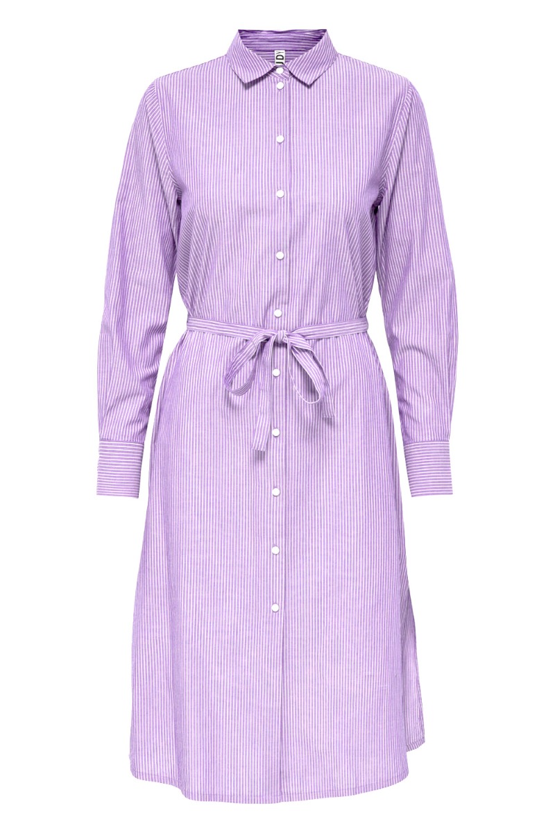 En klassisk skjortekjole fra JDY i hvid og lavendel i et løst a-snit. Kjolen har medfølgende bindebånd i taljen og knapper hele vejen ned foran, der gør det muligt at bruge den både åbent og lukket alt efter eget ønske.