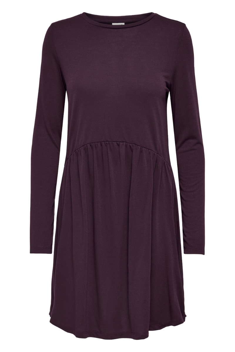Sød kjole fra JDY i bordeaux med peplum fra taljen og ned. Kjolen er lavet i den blødeste kvalitet der ikke krøller hvilket vi elsker hos Lykke by Lykke! Den er løst siddende med lange ærmer og rund hals.