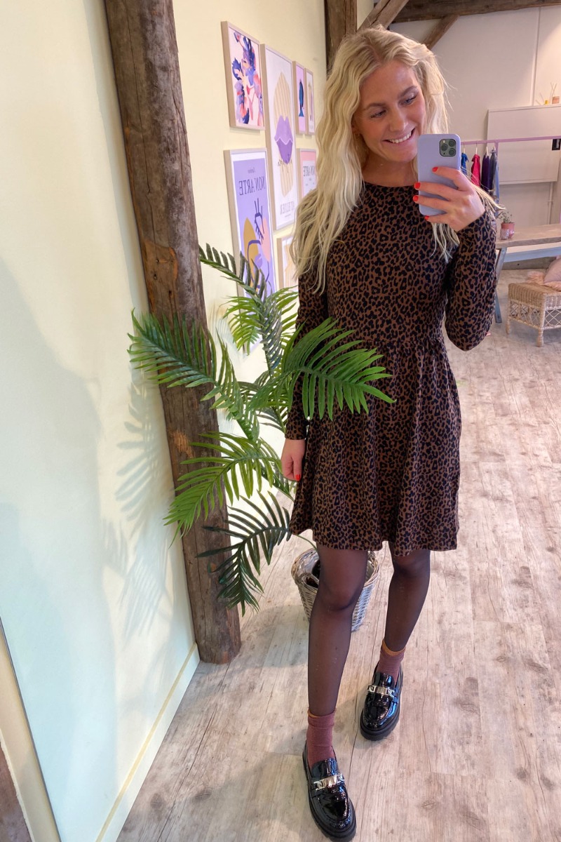 En sød dejlig blød kjole fra JDY i leoprint i brun og sort. Kjolen er lavet i et utrolig lækkert materiale der virkelig er skøn at have på med masser af stræk og elastik i taljen. Den har lange ærmer og rund udskæring. Style den med en støvle til hverdag.