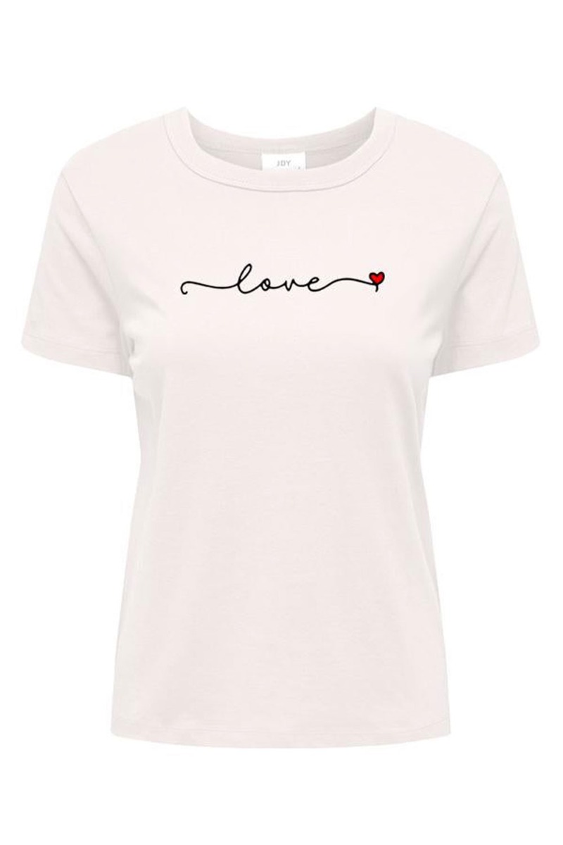 T-shirt fra JDY med rund halsudskæring. T-shirten har et hjerte print på brystet som en sød lille detalje. Findes også i rosa og sort med søde detaljer på. Er til den lille side, så ligger du mellem to størrelser, anbefaler vi den største.