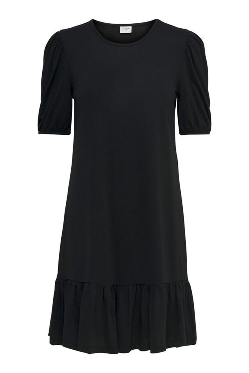 Helt enkel sort kjole fra JDY i det blødeste materiale med masser af stræk. Kjolen er løst siddende med rund hals og peplum i bunden. De korte ærmer har en lille pufdetalje ved skulderen og er super sød at style med en lille slippers til de varme sommerdage.