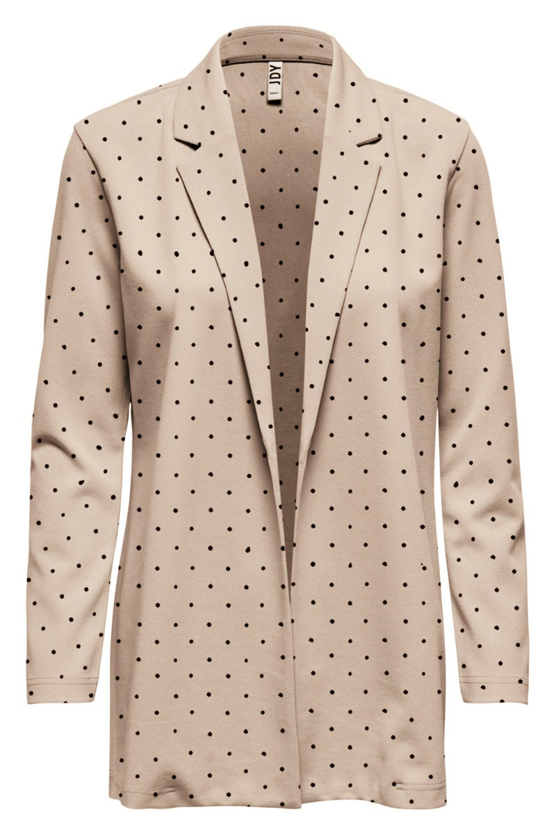 Super sød blazer fra JDY i beige med små sorte prikker. Blazeren er designet i et let behageligt materiale uden skulderpuder så den bliver en smule mere afslappet og vi ELSKER det! Den er åben fortil og er sød at bruge med de matchende bukser i samme fine print.