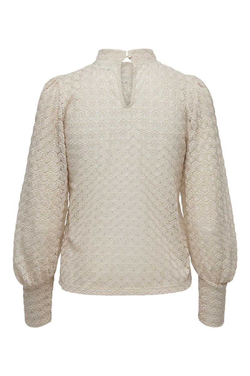 Den fineste bluse fra JDY! Blusen har et gennemsigtigt blondemønster, som virkelig giver den et feminint udtryk. Blusen har en højere hals og lukkes bagtil med en knaplukning som giver blusen en dråbeformet åbning. Derudover har den lange ærmer samt en lille rynkedetalje ved skulderen. Style blusen med en fin habitbuks eller en nederdel til festilige anledninger.