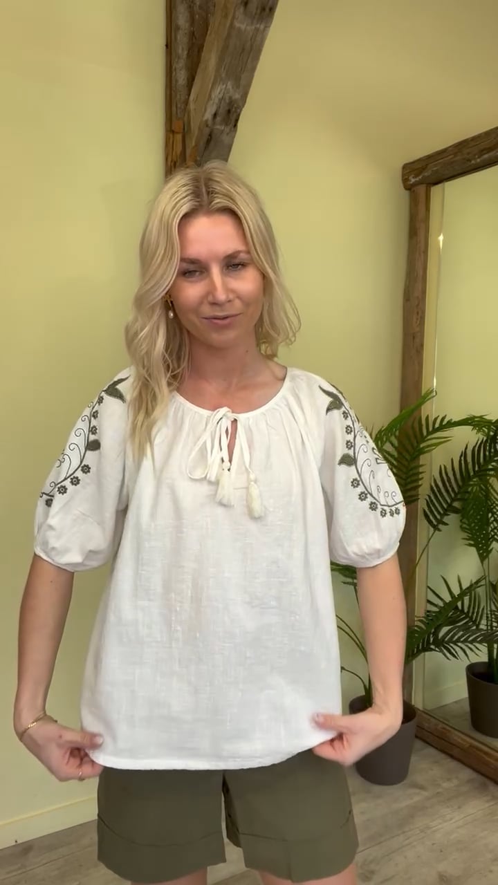 En nem og smuk sommertop fra JDY er kommet i hvid med smukt blomster broderi i blå. Den er med korte pufærmer og har en smuk sløjfe detalje ved brystet foran. Den er løs i pasformen og passer fint til et par jeans eller en nederdel.