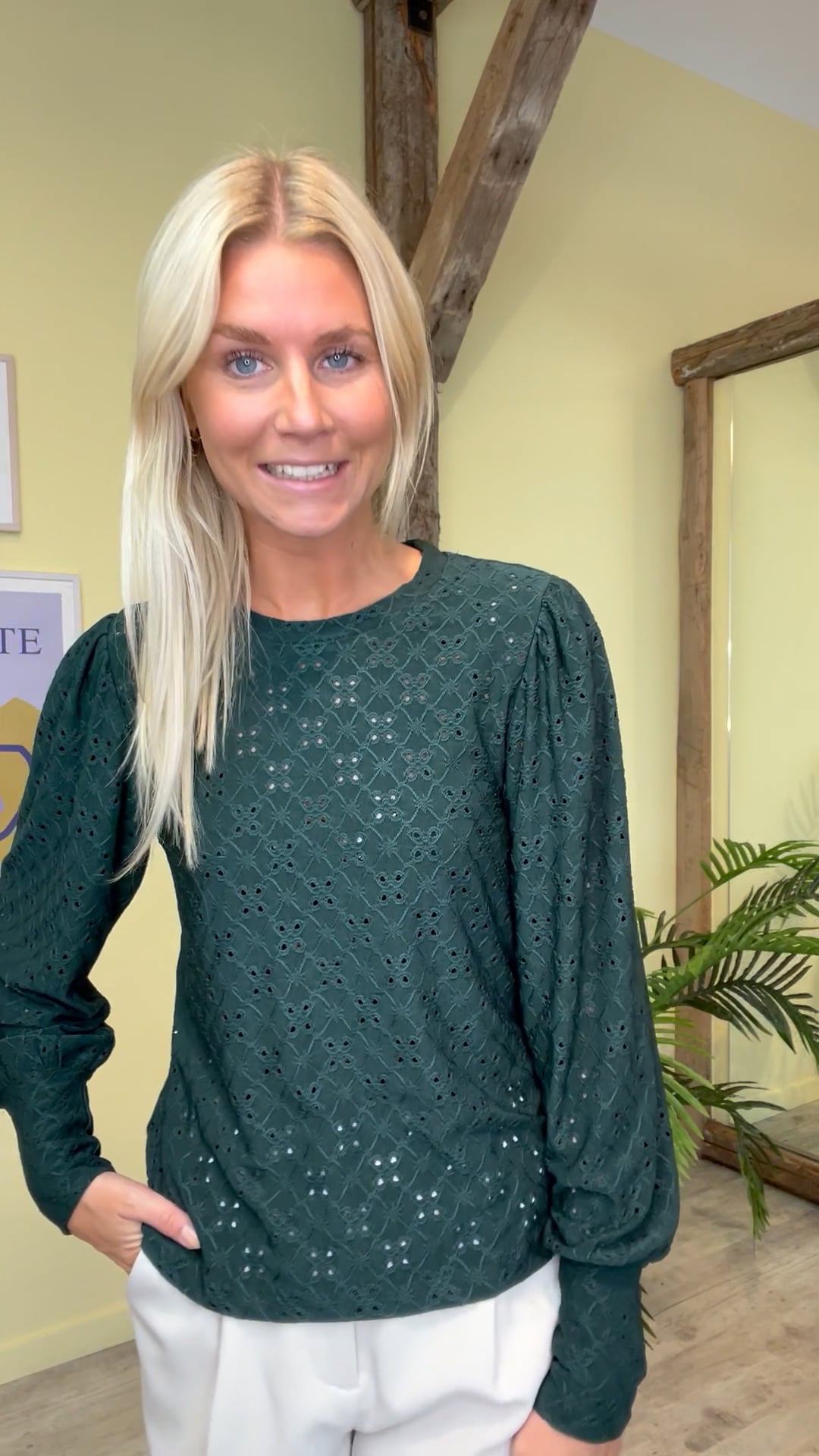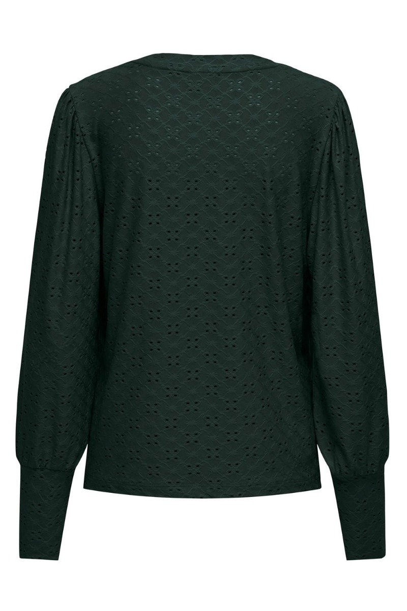 Smuk flaskegrøn bluse fra JDY. Blusen har fine ballonærmer som slutter med et fast stykke ved håndleddet. Blusen er i det fineste hullede broderingsmønster, som giver blusen et feminint look. Style blusen til et par jeans og en blazer til, for et flot hverdagslook.