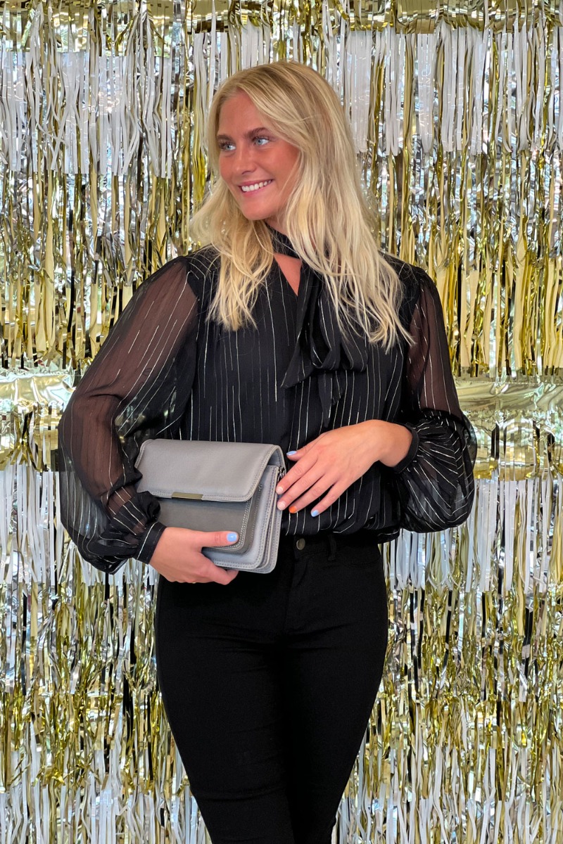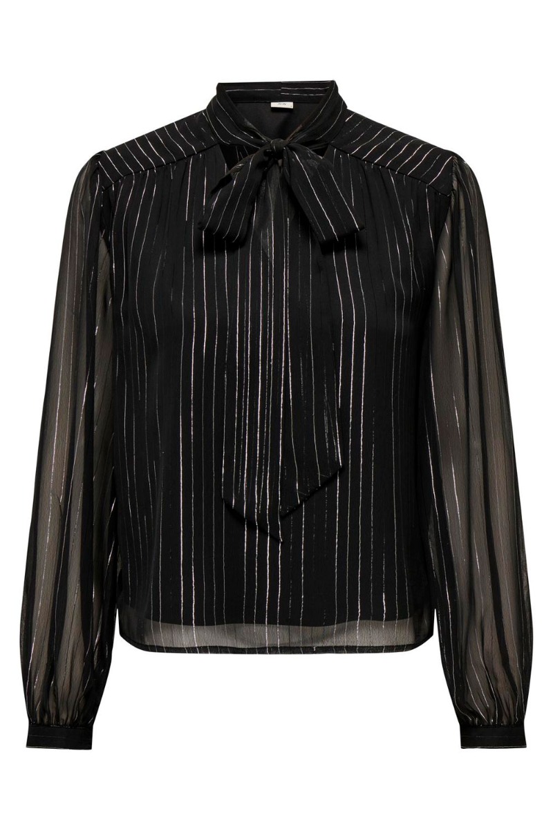 Super fin bluse fra JDY i et sort let tranparent materiale. Blusen er sort med en lille fin tynd sølv stribe samt en sløjfedetalje ved halsen. Der er en underbluse under, så det er kun ærmerne der er gennemsigtige. Printet findes også i en kjole model. Style den fine bluse til de kommende fester med et par af vores populære Cindysus bukser og en lille fin stillet, for et klassisk fest look.