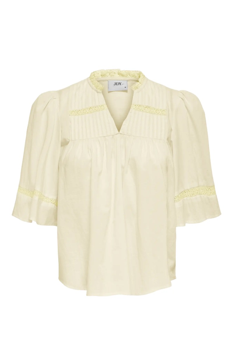 Smuk forårs bluse i en sart gul er landet fra JDY! Blusen har feminine detaljer og en v-hals. Den er rumlig og perfekt til forårs vejret. Den har blonder i kraven og som detlaje ved ærmet og ved brystet. Den kan styles til både jeans eller en fin nederdel.