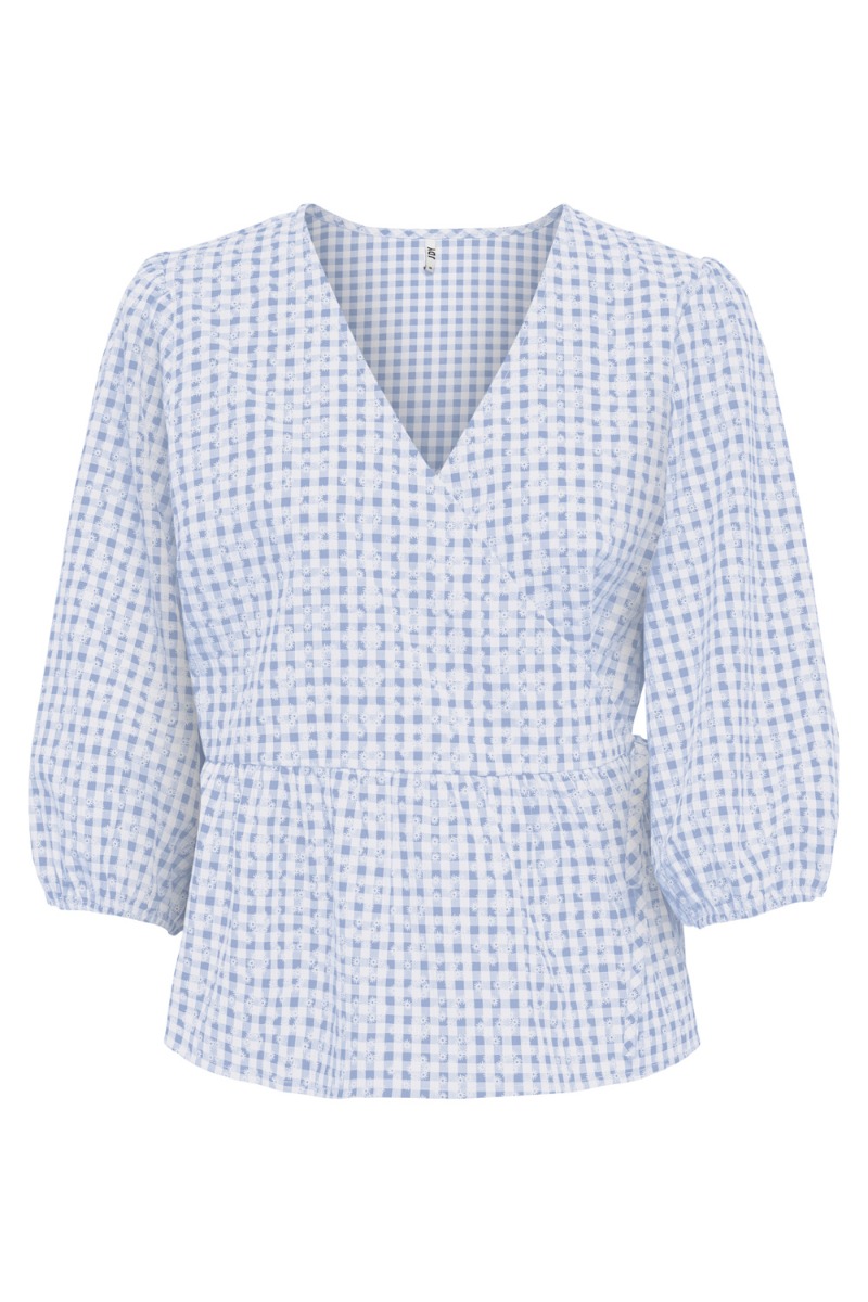 En fin bluse fra JDY i blå tern med små hvide blomster. Blusen er designet med slå-om der bindes i siden og skaber en v-udskæring der gør den ammevenlig. Blusen har en sød peplum i bunden og 3/4 ærmer med et lille puf. Style den til et par jeans eller shorts.