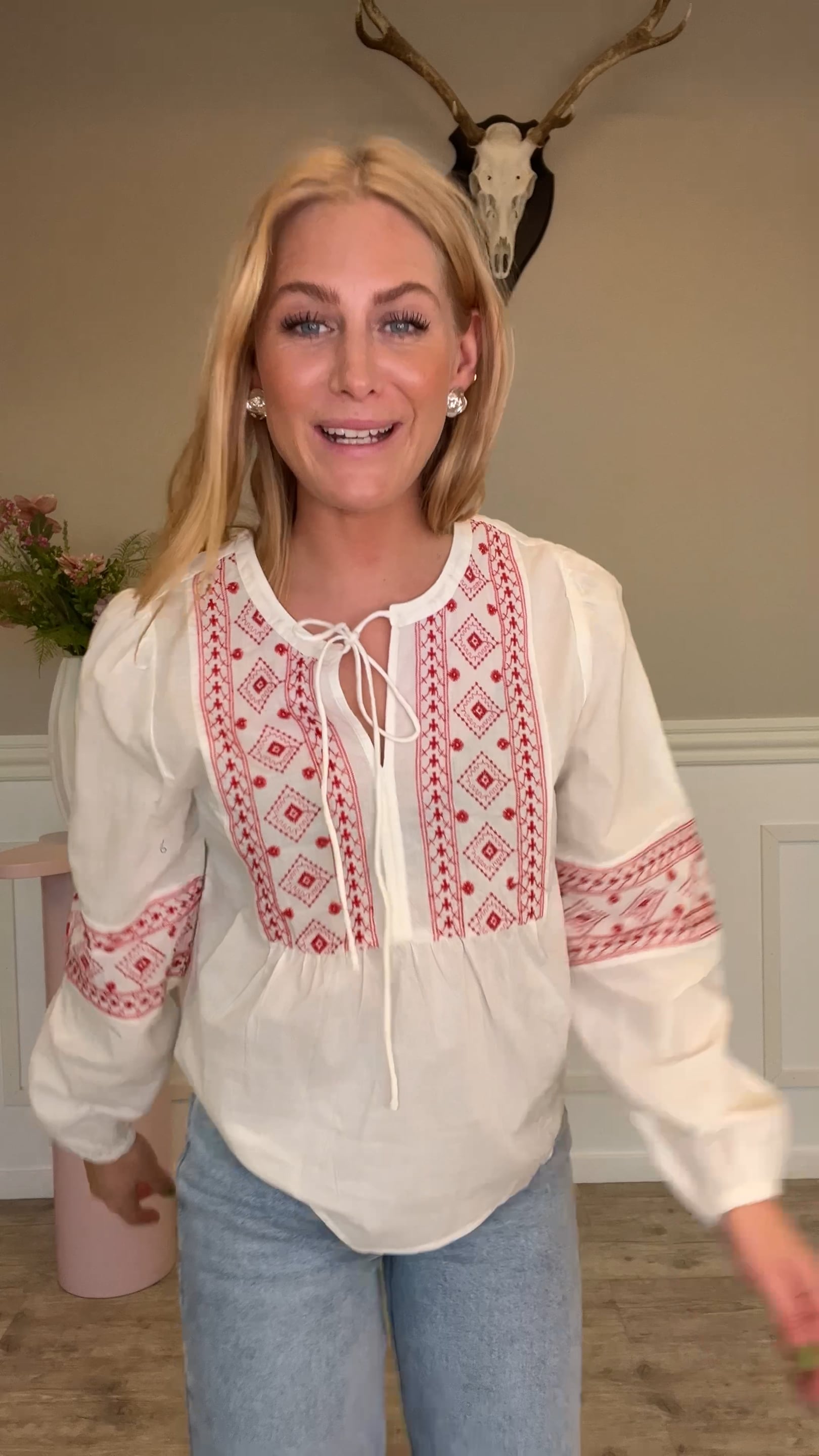 JDY - Bluse - Lulu L/S Embroidery Shirt - Cloud Dancer/red