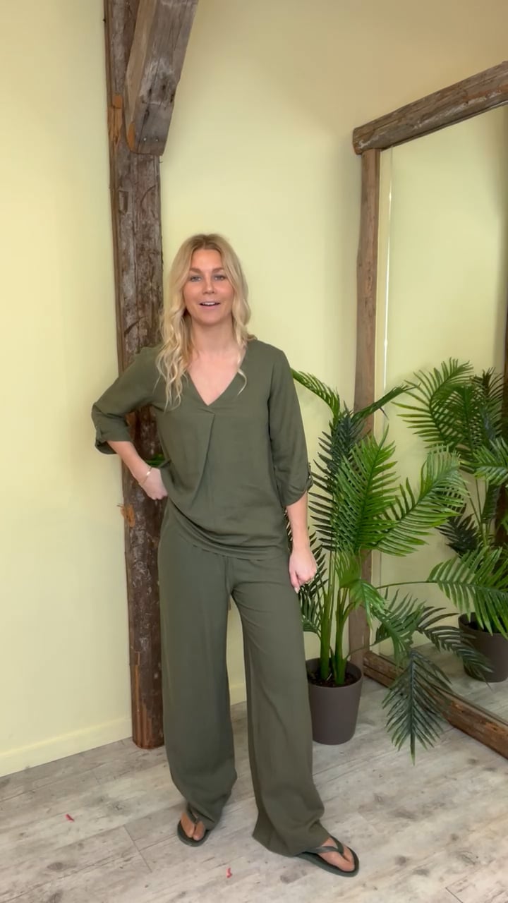En par nemme bukser i en dejlig blød hør kvalitet er kommet fra JDY i flere farver. Denne er i en fin army som kan styles til alt og som nemt også kan bruges sammen med de matchende overdel. Der er elastik i taljen og der er vide i benene. De findes også i army og brun.