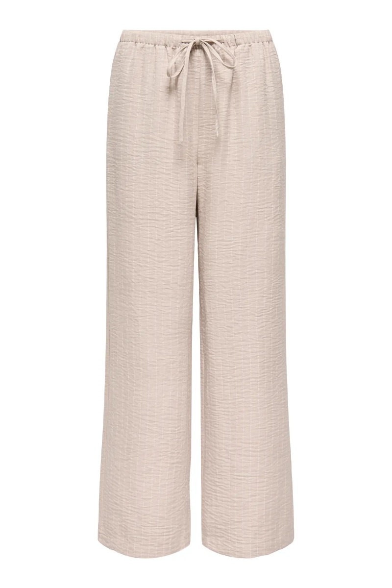 Et par gode bukser i en dejlig let kvaliet er landet fra JDY. Disse er beige med hvide nålestriber. Den er med bindebånd i taljen og et smalt elastik. Viden i benene giver også et afslappet look hvor de også er perfekte til de matchende overdele.