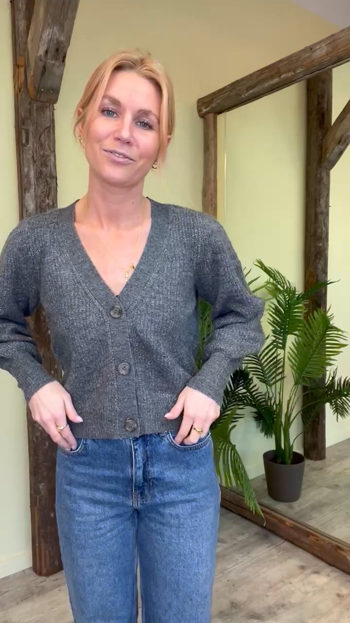 En fin cardigan fra JDY er kommet i en mørkegrå farve. Den er løs i pasformen og tynd i strikken. Derfor er den også god som en sommer cardigan, da den ikke er for varm. Den er med V hals og ærmerner har en smule balloneffekt. En nem cardigan der passer til alt.