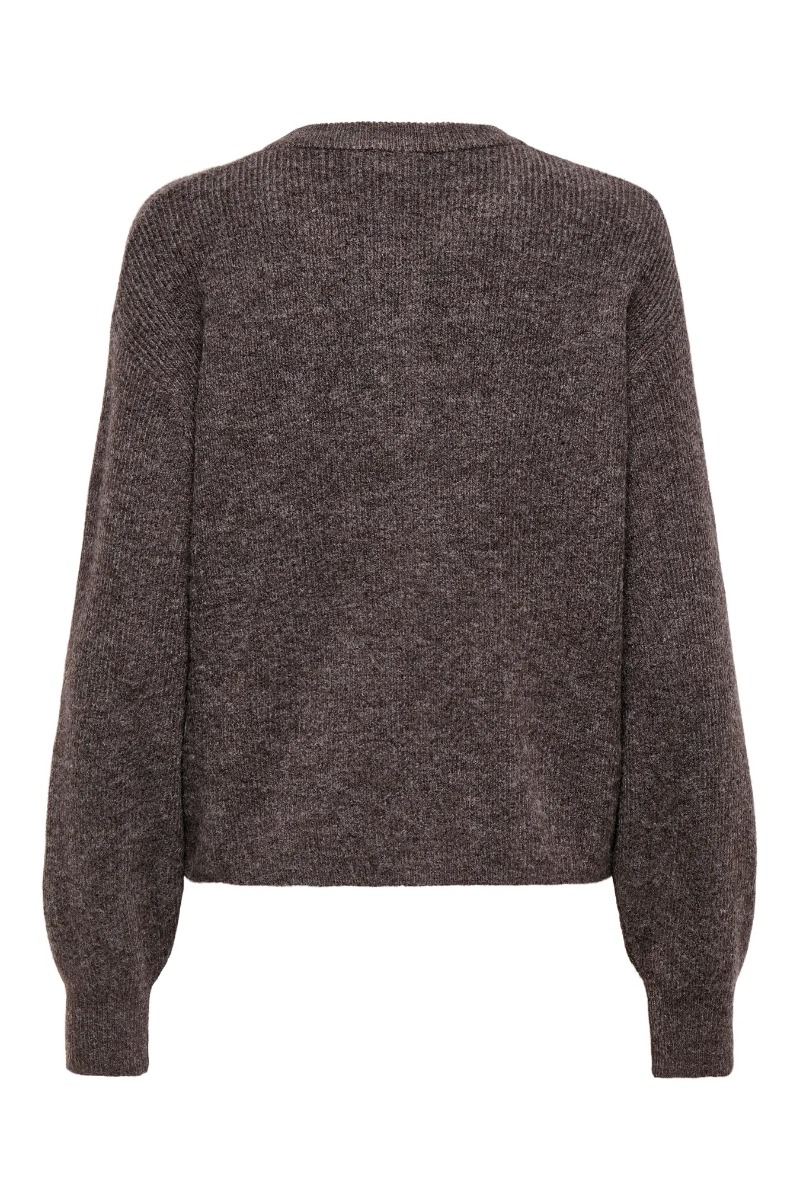 En fin strik cardigan fra JDY er kommet i denne nye brune farve. Den er en kendt model som altid er en sikker vinder til de koldere måneder. Den har fine perlemors farvet perler foran til lukning og afsluttes i en rund krave med rib kant.