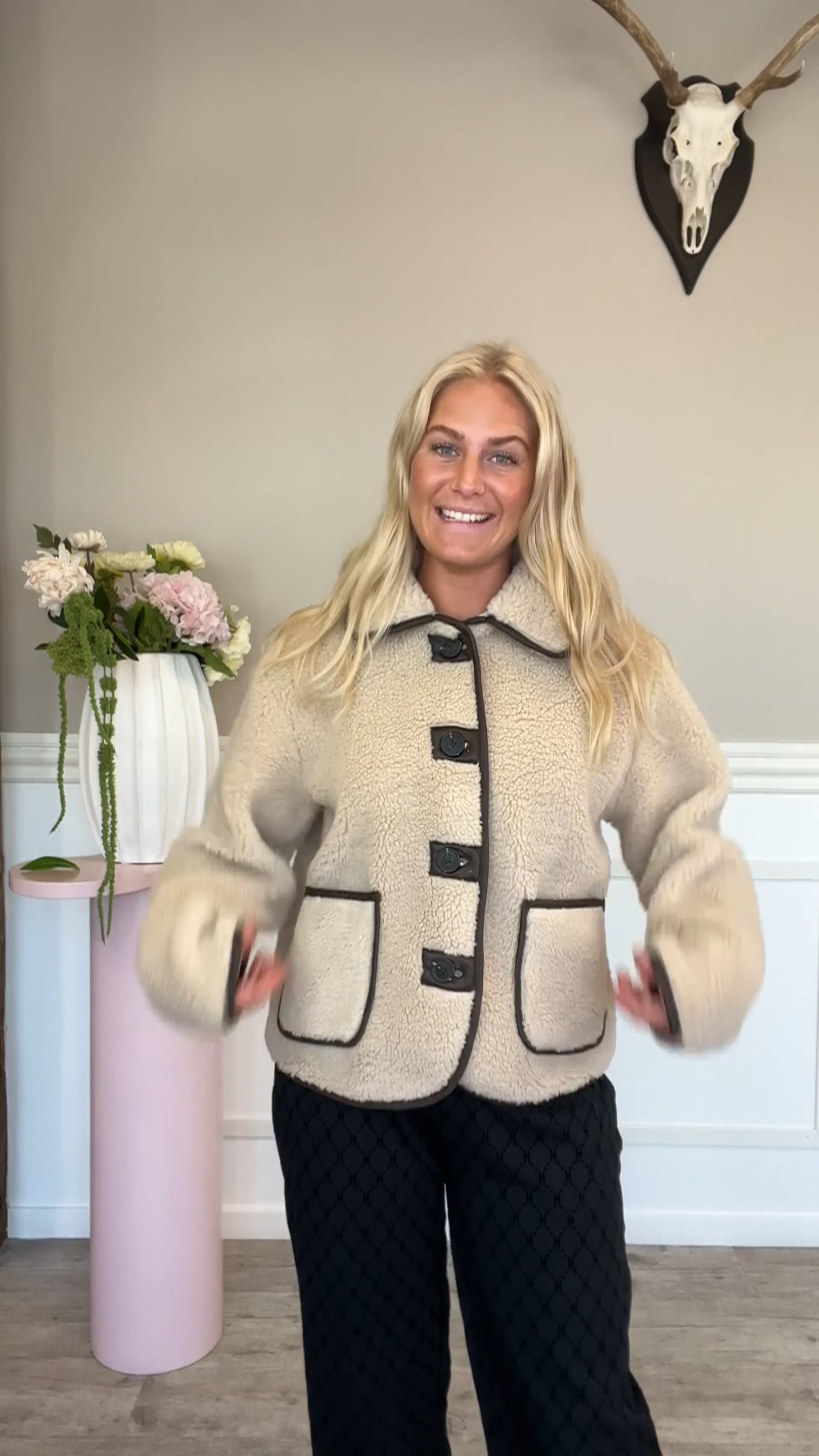 Super lækker jakke fra JDY! Den er i det blødeste fluffy materiale og med fine knap detaljer foran. Den er med krave og brune detaljer ved ærmer. Den er helt perfekt som eftårsjakke eller til de lidt varmere vinterdage!