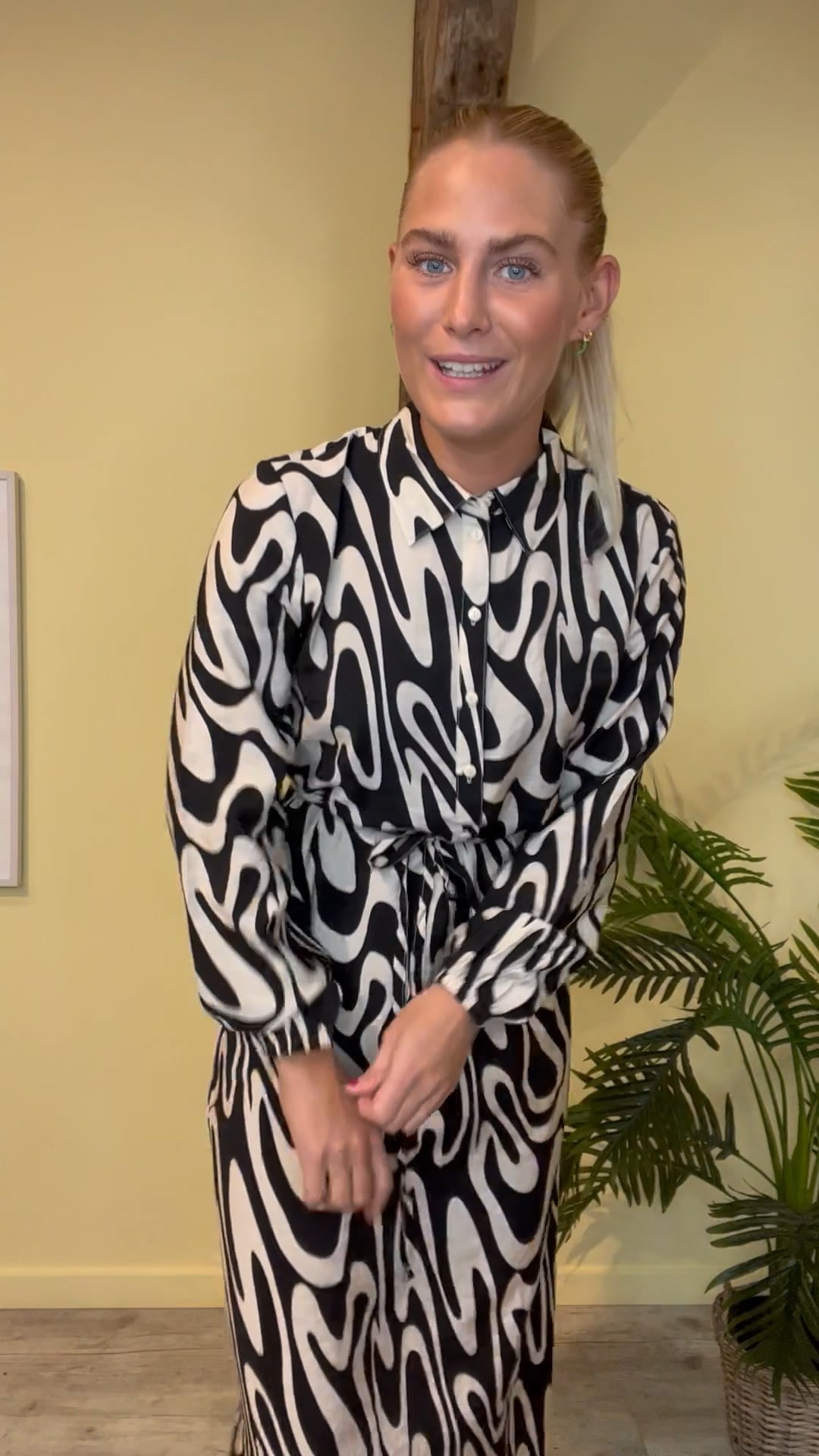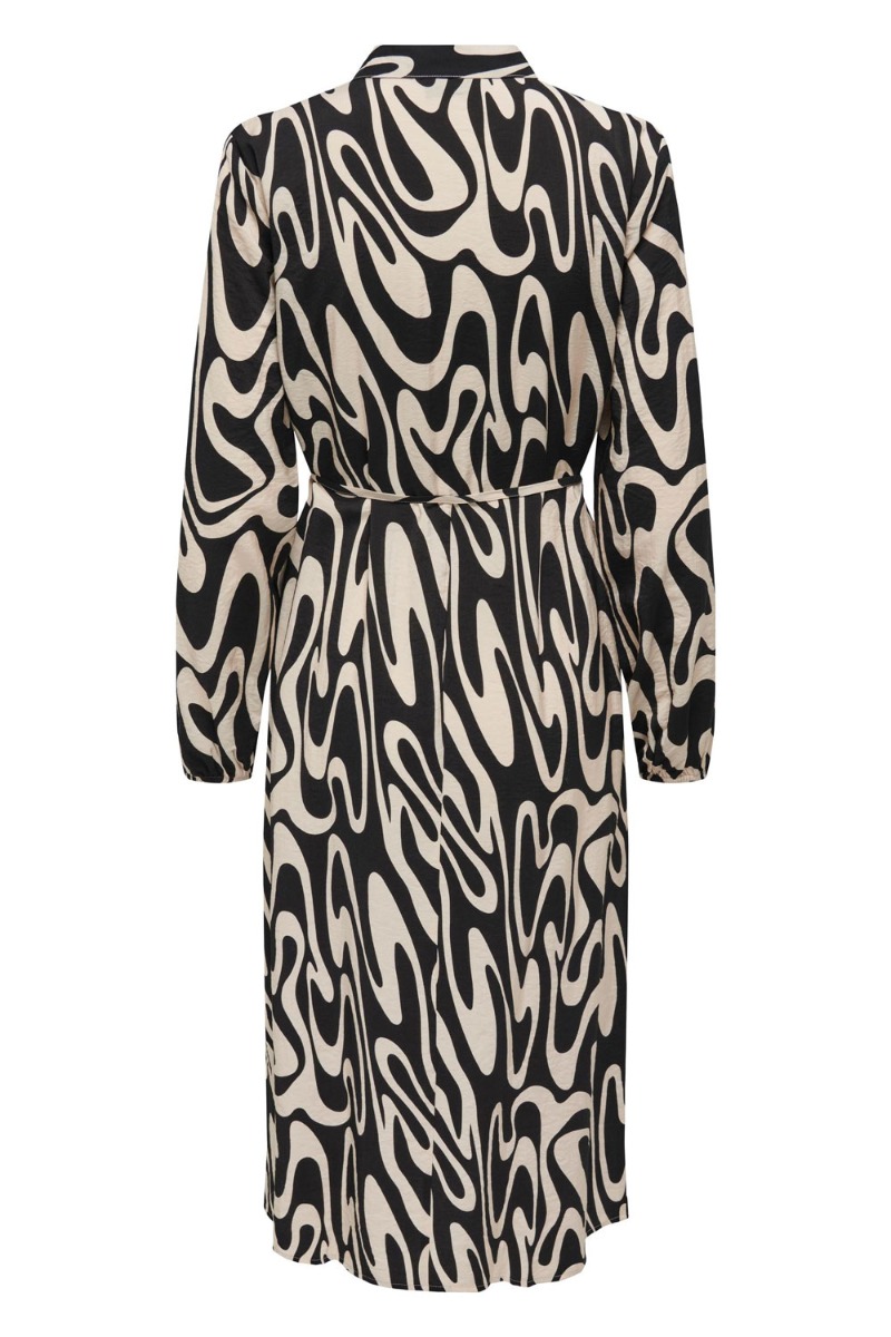 En fin hverdags kjole fra JDY med hvidt og sort stribet mønster. Den er let i kvaliteten og kan knappes ned til taljen. Derudover er der sat et tyndt bindebånd i taljen som kan tages af hvis det ønskes. Mønstret findes også i en skjorte.