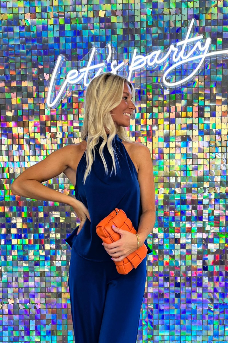 Sejeste og smukkeste halterneck top fra JDY i en skøn kongeblå nuance. Den har et løstsiddende snit med halterneck snit. Den lukkes i nakken med to stofbetrukne knapper. Toppen er oplagt til festlig brug og super smuk at style med de matchende bukser.