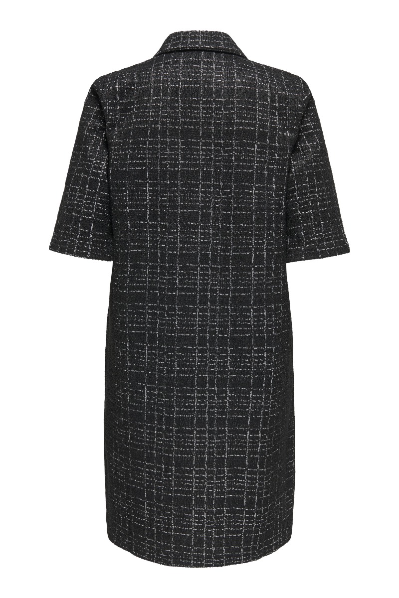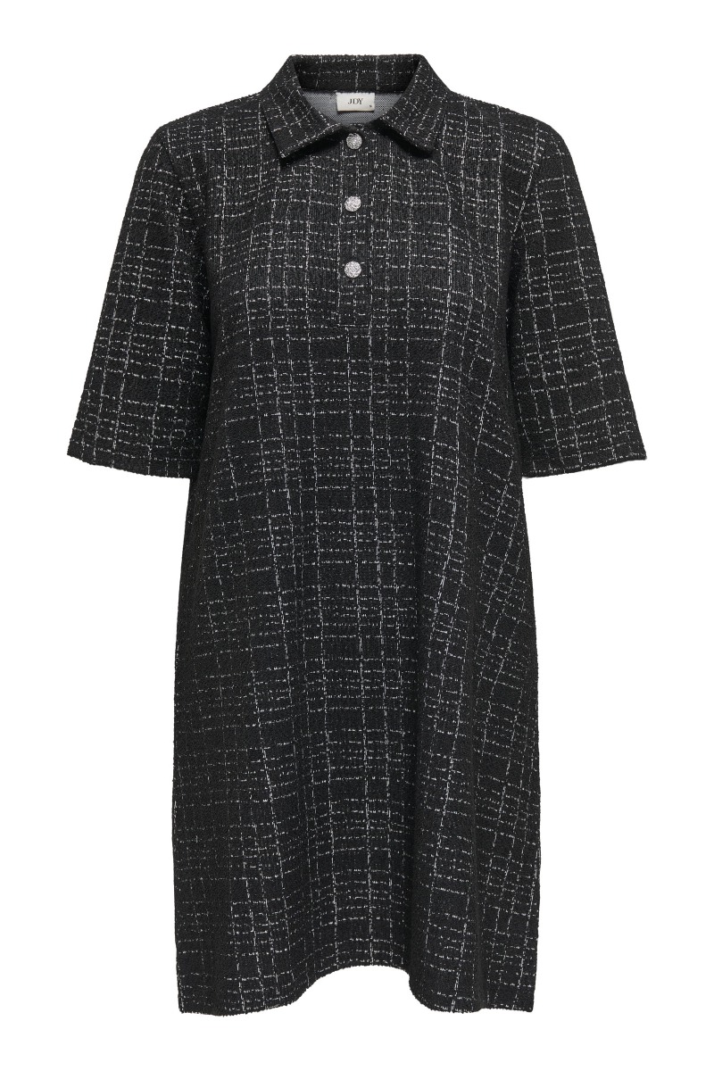Kjole med mønster fra JDY. Denne kjole har et enkelt men elegant design. Kjolen er sort med ternet mønster i hvid tråd. Den har et taknemmeligt snit og passer alle kropsfigurer. Brug den til hverdag eller med en fin sko/loafer til en særlige anledning.