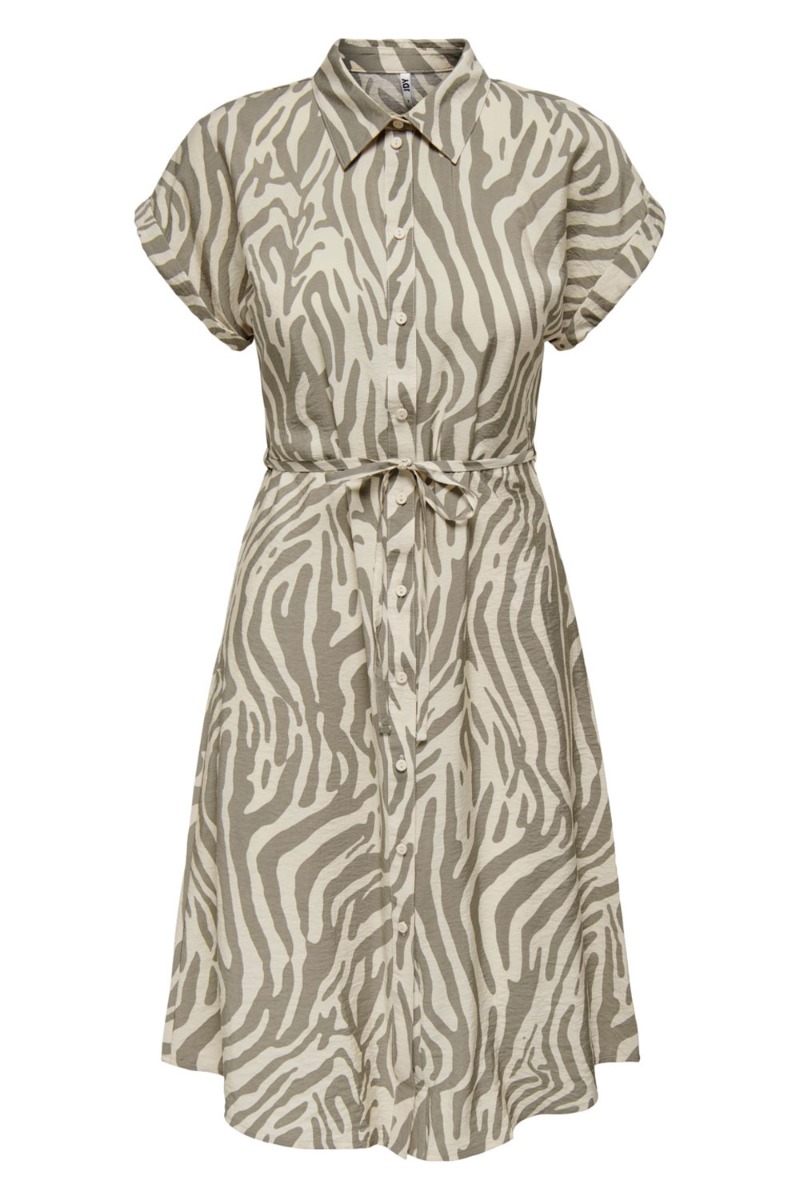 Skjorte kjole fra JDY i zebraprint i army og beige. Kjolen har knaplukning foran hele vejen ned og medfølgende bindebånd til at skabe en feminin talje. Den er designet i en let luftig kvalitet og har matchende bukser.
