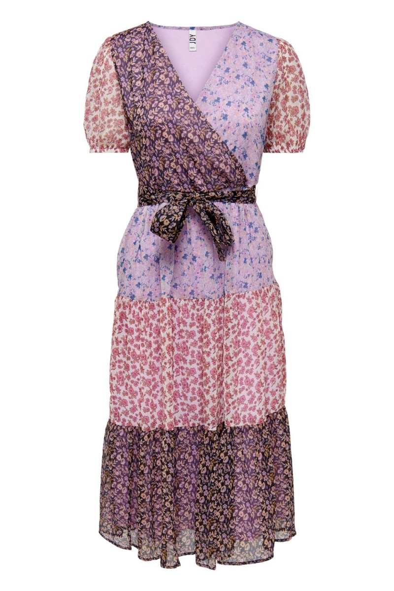 En utrolig smuk kjole fra JDY vi virkelig har glædet os til at vise jer! Kjolen har en sød pasform med elastik i taljen og bindebånd der giver en sød slå-om-effekt. Kjolen er designet i et grafisk print med firkanter og forskellige blomsterprint der giver en sød detalje. De korte ærmer afsluttes med elastikkant og er super smuk med en sneaks, sandal eller stilet alt efter anledning.