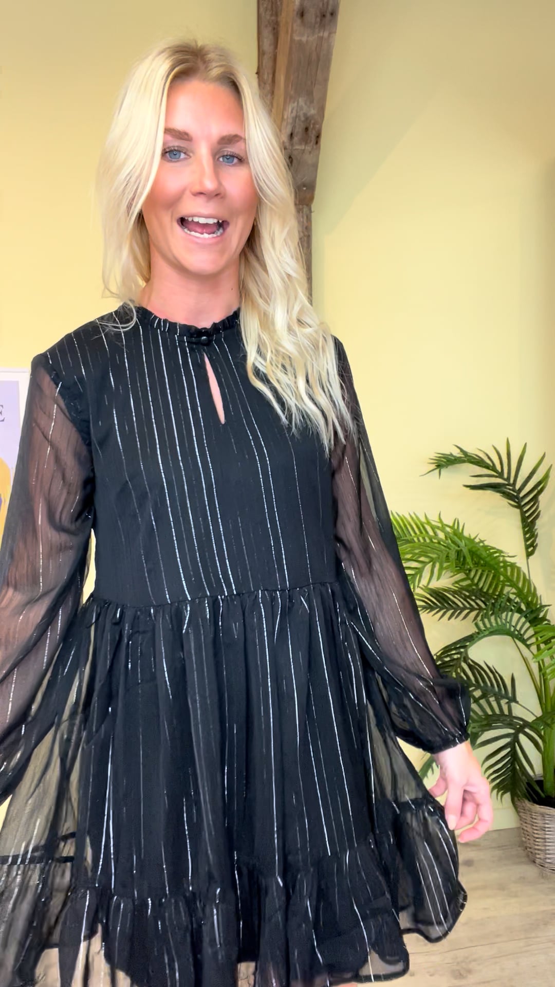 Fineste kjole fra JDY i en rummelig pasform og som passer til de fleste kropstyper. Kjolen har transparente ærmer som afsluttes med en elastikkant ved håndleddet, hvilket giver kjolens ærmer et lille ballonsnit. Kjolen er med de fineste sølvstriber og med en lille knappedetalje i halsen samt en lille flæsekant.