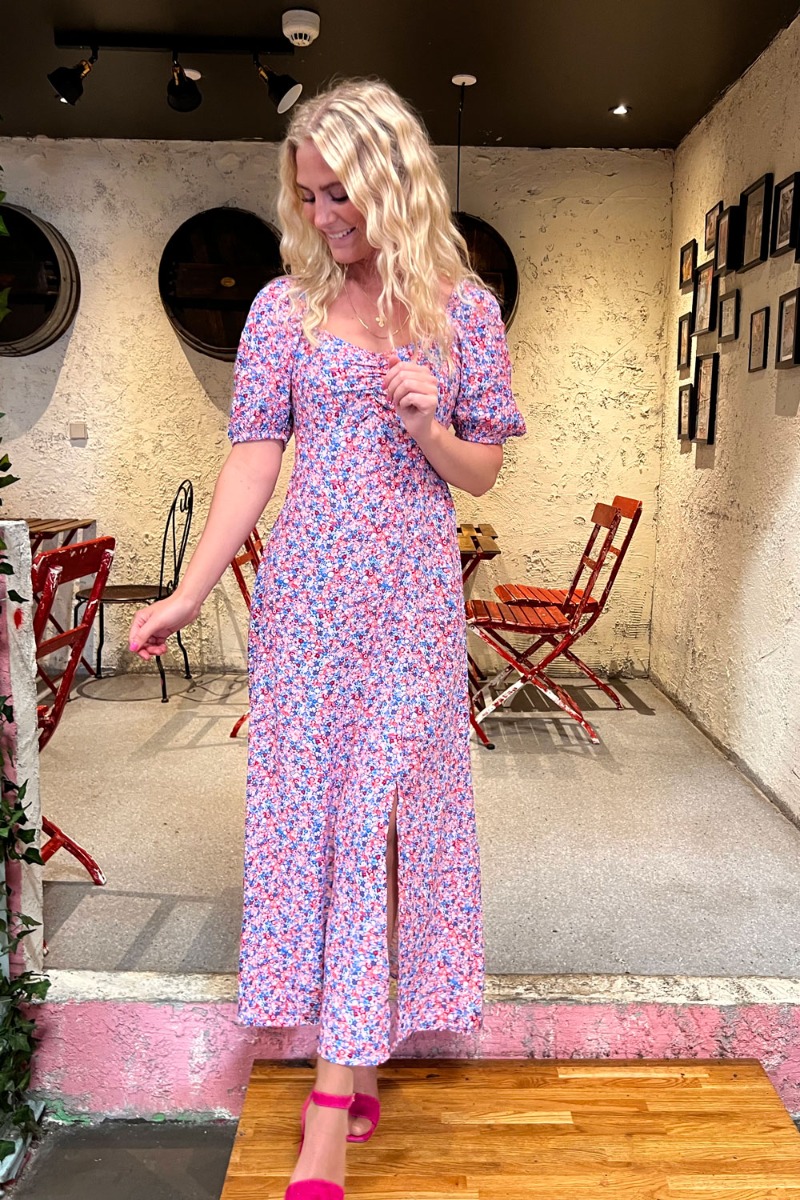 En rigtig sød kjole fra JDY med et lille grafisk blomsterprint i lyserød, røde og blå nuancer. Kjolen har en virkelig smuk pasform der er feminin med slidsdetalje foran. Den er med korte pufærmer og en flot udskæring foran.
