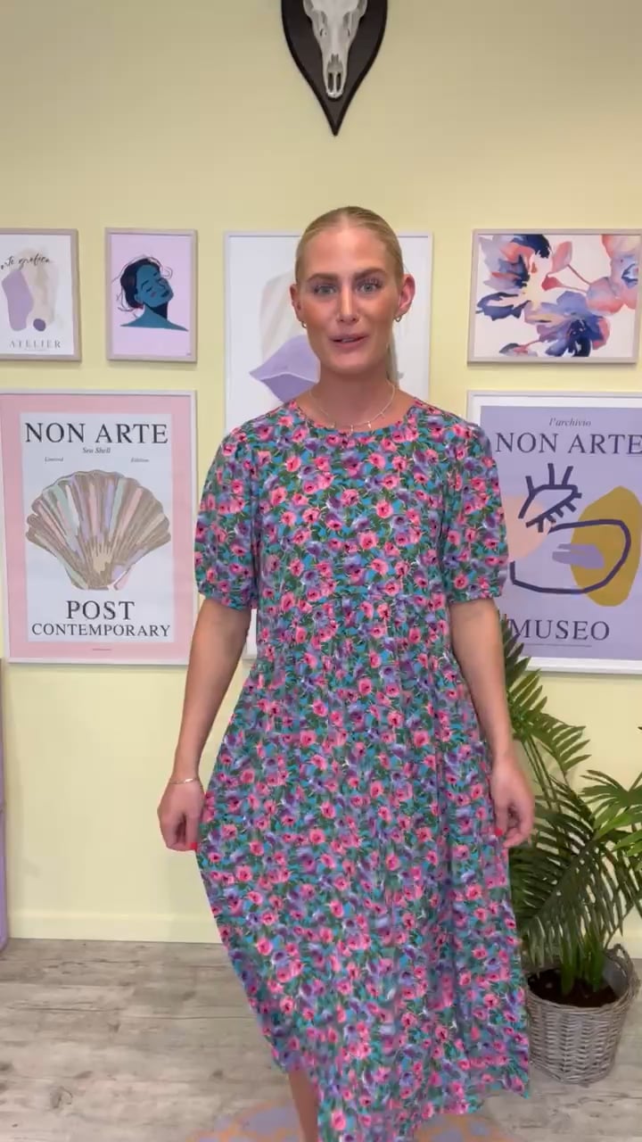 En klassisk sød kjole fra JDY i et fint snit der har en to-delt-effekt. Kjolen er løs med det flotteste blomsterprint i lilla og pink med grønne blade på en smuk turkis baggrund. Man kan kun blive glad af det her smukke print. Kjolen har korte pufærmer og er sød at bruge til hverdag og kan nemt styles op.