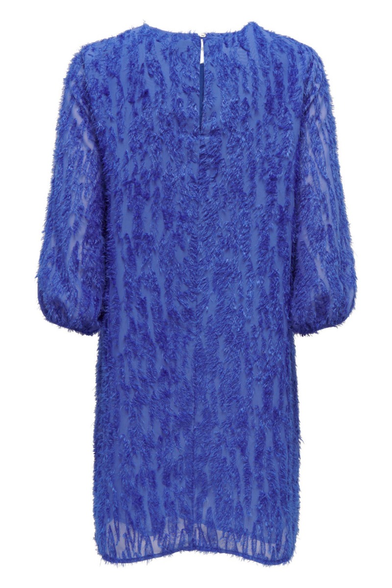 En fin blå kjole fra JDY i en skøn og let kvalitet. Kjolen har dette fjer look som ikke er rigtige fjer men som giver dette 3D look. Derudover er der 3/4 lange ærmer og den lukkes i nakken med en lille knap der danner en hul detalje bagpå. Den findes i flere farver.